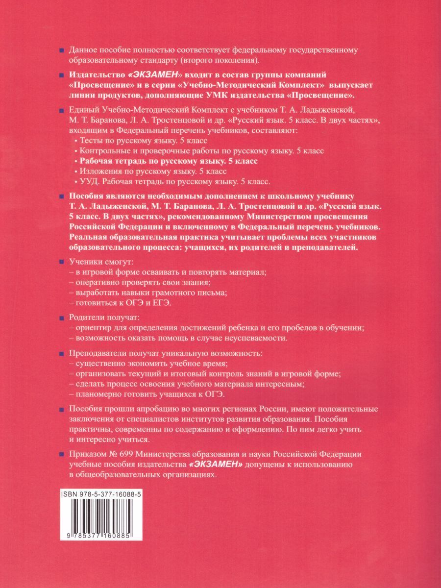 Данное пособие полностью соответствует федеральному государственному образовательному стандарту (второго поколения). В рабочей тетради содержатся дополнительные задания к каждому разделу учебника, выполняя которые ученик сможет глубже осмыслить теоретический материал, разобраться с помещенными в учебнике правилами, научиться применять эти правила на практике, узнать об особенностях разных видов текстов и потренироваться в их создании, поупражняться в фонетическом, морфемном и грамматическом разборах. В пособии также предусмотрена система заданий, помогающая освоить не только новый материал, но и повторять пройденный, что способствует выработке устойчивых навыков грамотного письма и речи. Издание рассчитано на учителей русского языка, методистов, учащихся.Характеристики