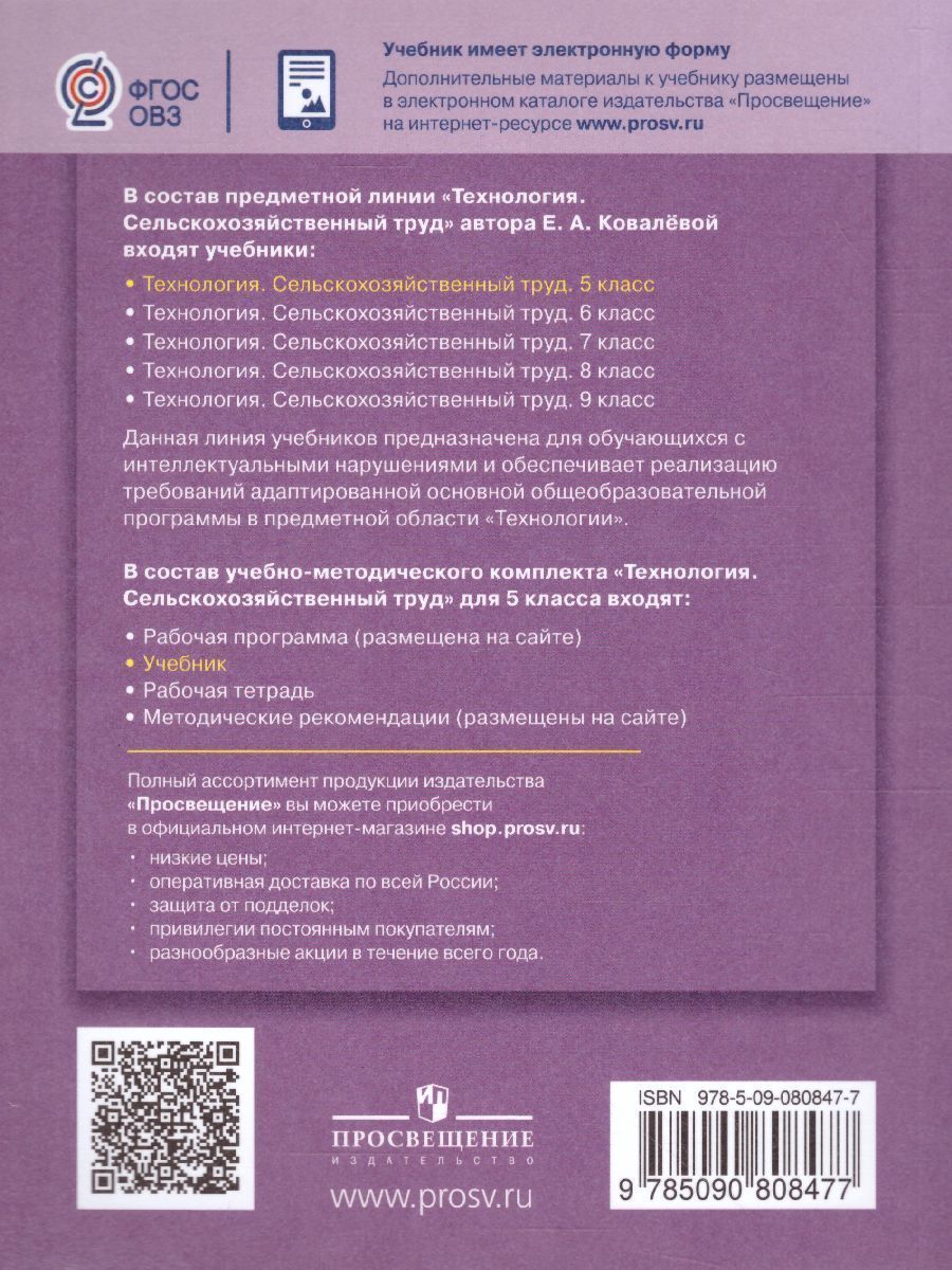 Учебник предназначен для обучающихся с интеллектуальными нарушениями и обеспечивает реализацию требований адаптированной основной общеобразовательной программы в предметной области «Технологии». Материал учебника направлен на всестороннее развитие личности обучающихся с интеллектуальными нарушениями в процессе формирования их трудовой культуры и способствует получению первоначальной профильной трудовой подготовки, предусматривающей формирование в процессе учёбы и общественно полезной работы практических умений и навыков в предметно-преобразующей деятельности. Учебник знакомит учащихся с основными сельскохозяйственными работами: уборкой и сортировкой урожая и корма; содержит информацию о биологических особенностях картофеля, гороха и фасоли, агротехнике их возделывания, сведения об уходе за кроликами, выращивании цветочных растений.Характеристики