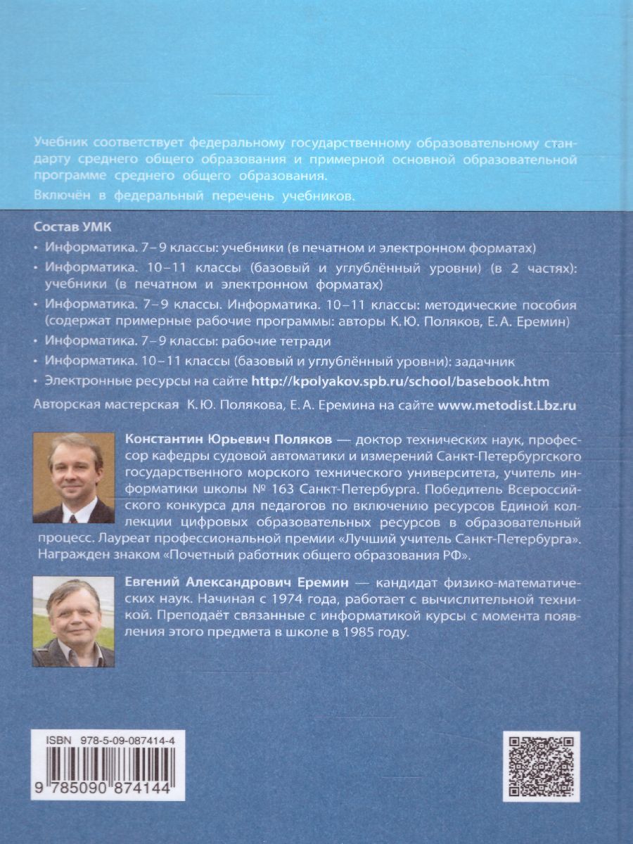 Учебное издание предназначено для изучения курса информатики на базовом уровне в 11 классах общеобразовательных учреждений. Содержание учебника является продолжением курса 10 класса и опирается на изученный в 7–9 классах курс информатики для основной школы. Рассматриваются вопросы передачи информации, информационные системы и базы данных, разработка веб-сайтов, компьютерное моделирование, методы объектно-ориентированного программирования, компьютерная графика и анимация. Учебник входит в учебно-методический комплект (УМК), включающий также учебник для 10 класса и компьютерный практикум. Соответствует Федеральному государственному образовательному стандарту среднего (полного) общего образования (2012 г.) и примерной основной образовательной программе среднего общего образования.Характеристики
