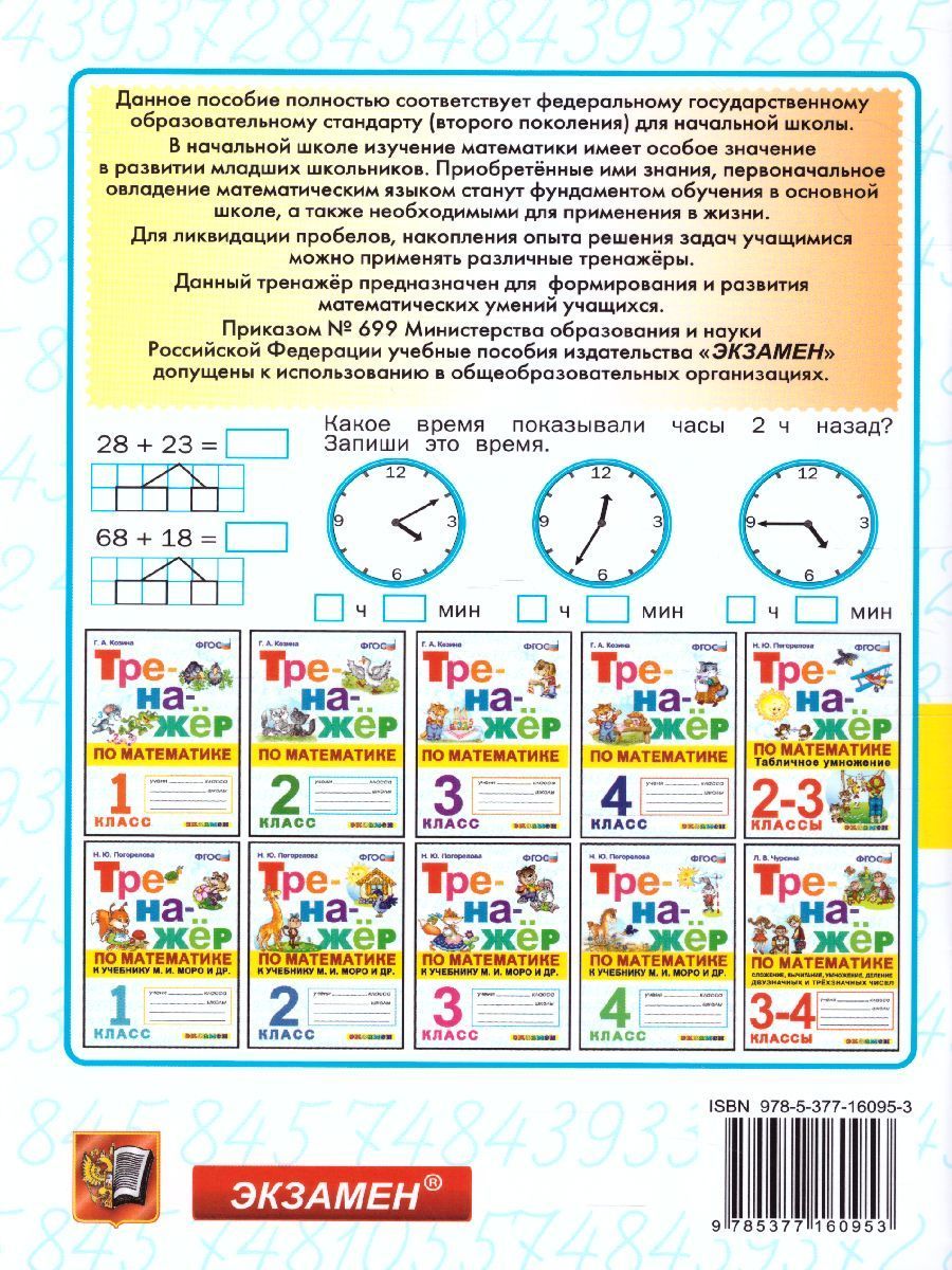 Данное пособие полностью соответствует федеральному государственному образовательному стандарту (второго поколения) для начальной школы. Пособие содержит разнообразные задания по всем основным разделам математики и имеет целью оказать взрослым помощь в подборе упражнений для повторения, закрепления и систематизации математических знаний у детей. В пособии приведено достаточное число упражнений, способствующих выработке навыков устных и письменных вычислений, сравнения чисел, измерений и построений, решения задач, определения времени.Характеристики