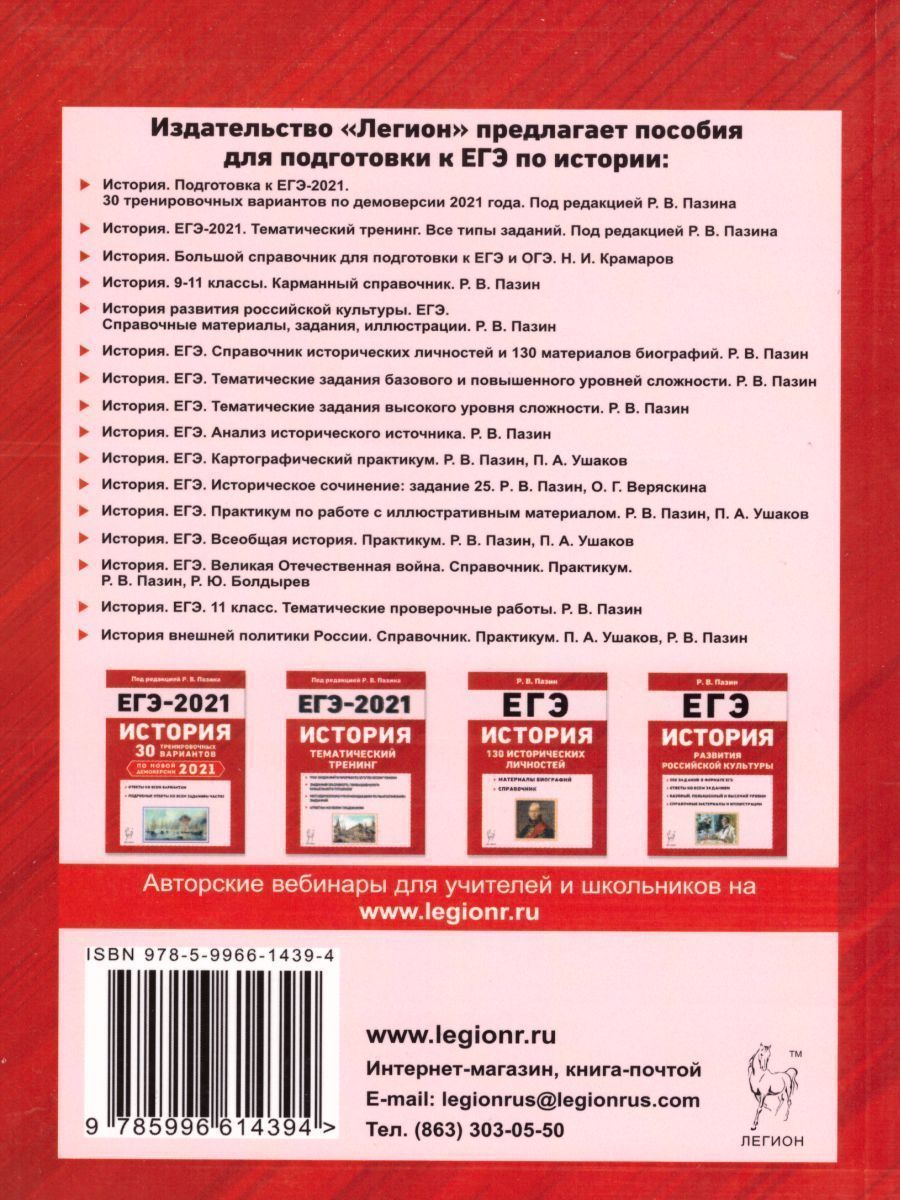 Оно содержит: • 900 заданий, сгруппированных по темам, знание которых проверяется на ЕГЭ; • все типы заданий и варианты их формулировок; • методические рекомендации по выполнению всех типов заданий; • ответы ко всем заданиям. Книга поможет систематизировать изученный материал, повторить его и отработать все необходимые умения и способы учебных действий перед тем, как приступить к завершающей фазе подготовки — к решению тренировочных вариантов (пособие под редакцией Р. В. Пазина «История. Подготовка к ЕГЭ-2021. 30 тренировочных вариантов по демоверсии 2021 года»).Характеристики