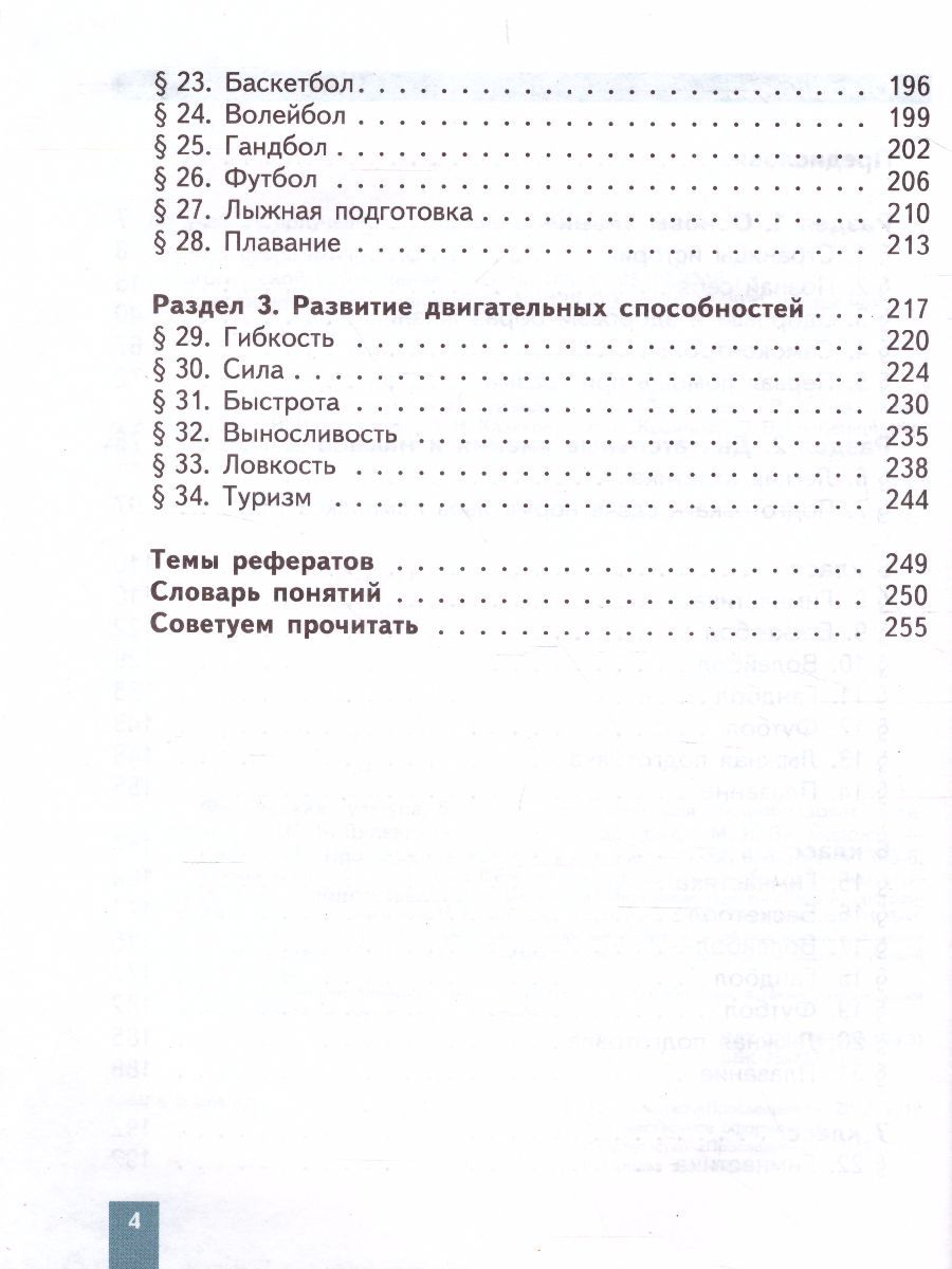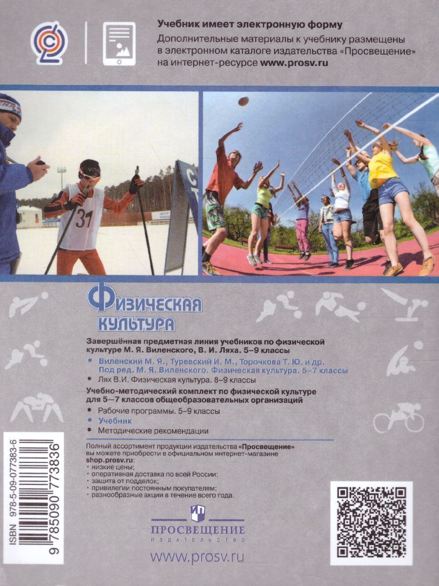 Настоящий учебник написан в соответствии с рабочей программой по физической культуре для учащихся 5—9 классов (автор В. И. Лях) и содержит основные сведения о здоровье и здоровом образе жизни, о влиянии физических упражнений на системы организма человека, о принципах самоконтроля во время занятий физической культурой и спортом, а также перечень мероприятий по оказанию первой помощи при травмах. Большое внимание в учебнике уделено развитию двигательных способностей, умений и навыков в изучаемых видах спорта - гимнастике, баскетболе, волейболе, футболе, плавании, лыжном спорте. Издание претерпело ряд изменений, коснувшихся как оформления обложки, так и материала учебника: он дополнен параграфом "Подготовка к сдаче нормативов комплекса ГТО", новыми понятиями в словаре терминов и новыми темами рефератов. Кроме того, в обновлённой версии учебника подробно говорится о значении оздоровительной ходьбы, рассматриваются принципы подготовки к туристскому походу и правила поведения во время похода.Характеристики