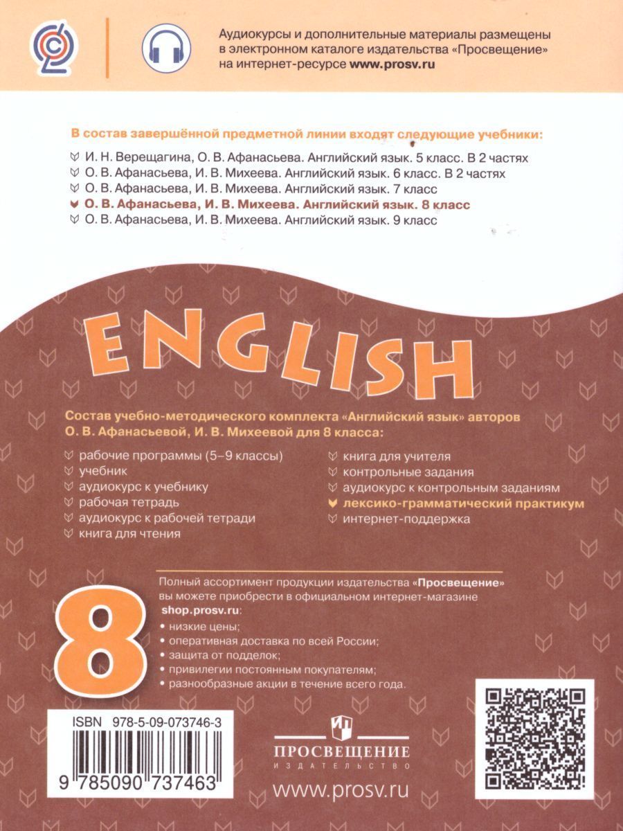 Пособие является составным компонентом учебно-методического комплекта "Английский язык" для 8 класса общеобразовательных организаций и школ с углублённым изучением английского языка и предназначено для проверки уровня сформированности грамматических и лексических навыков учащихся. Пособие чётко структурировано и подходит как для работы в классе, так и для само-стоятельной подготовки дома. Ключи для самопроверки размещены в конце книги.Характеристики