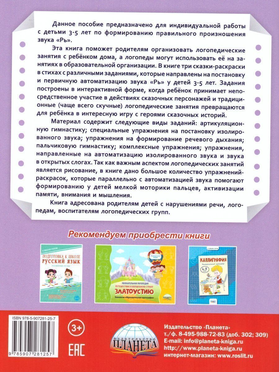 Данное пособие предназначено для индивидуальной работы с детьми 3-5 лет по формированию правильного произношения звука «Рь». Эта книга поможет родителям организовать логопедические занятия с ребёнком дома, а логопеды могут использовать её на занятиях в образовательной организации. В книге три сказки-раскраски в стихах с различными заданиями, которые направлены на постановку и первичную автоматизацию звука «Рь» у детей 3-5 лет. Задания построены в интерактивной форме, когда ребёнок принимает непосредственное участие в действиях сказочных персонажей и традиционные (чаще всего скучные) логопедические занятия превращаются для ребёнка в интересную игру с героями сказочных историй. Материал содержит следующие виды заданий: артикуляционную гимнастику; специальные упражнения на постановку изолированного звука; упражнения на формирование речевого дыхания; пальчиковую гимнастику; комплексные упражнения; упражнения, направленные на автоматизацию изолированного звука и звука в открытых слогах. Так как важным аспектом логопедических занятий является рисование, в книге дано большое количество упражнений-раскрасок, которые параллельно с автоматизацией звука помогают формированию у детей мелкой моторики пальцев, активизации памяти, внимания и мышления. Книга адресована родителям детей с нарушениями речи, логопедам, воспитателям логопедических групп.Характеристики