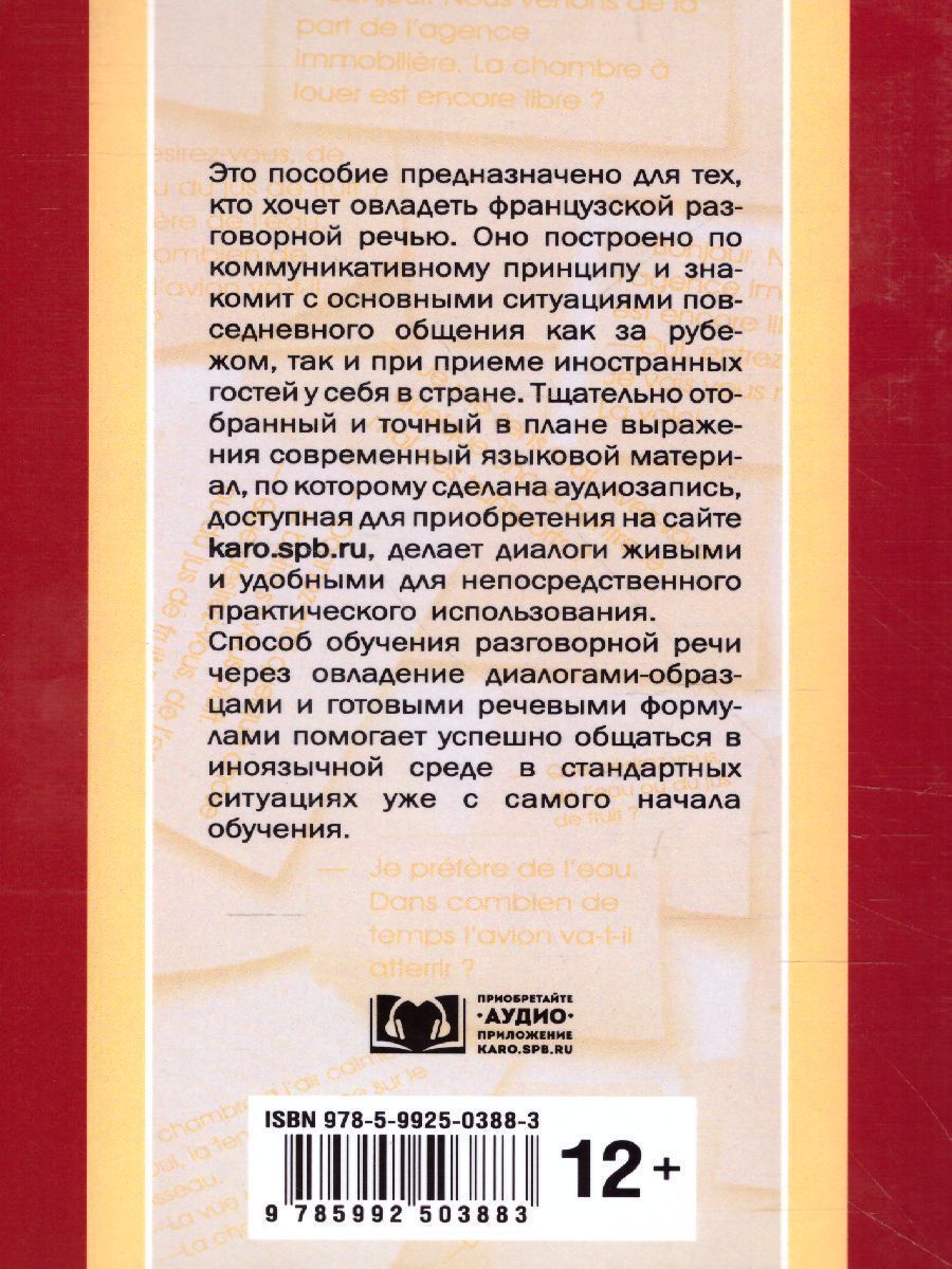 Это пособие предназначено для тех, кто хочет овладеть французской разговорной речью. Оно построено по коммуникативному принципу и знакомит с основными ситуациями повседневного общения как за рубежом, так и при приеме иностранных гостей у себя в стране. Тщательно отобранный и точный в плане выражения современный языковой материал, записанный на компакт-диск, делает диалоги живыми и удобными для непосредственного практического использования. Способ обучения разговорной речи через овладение диалогами-образцами и готовыми речевыми формулами помогает успешно общаться в иноязычной среде в стандартных ситуациях уже с самого начала обучения. Поэтому, в первую очередь, оно может быть рекомендовано для тех, кто собрался за рубеж.Характеристики