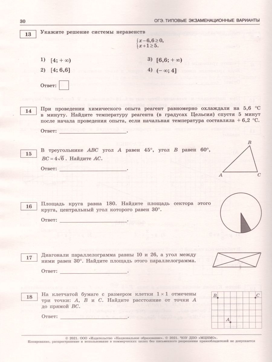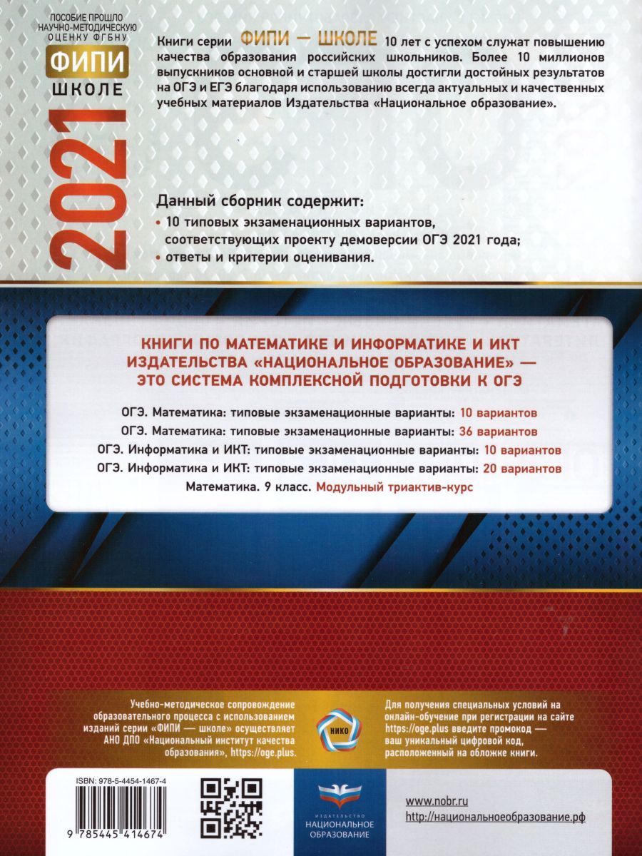 Пособие прошло научно-методическую оценку ФГБНУ «ФИПИ» Серия подготовлена разработчиками контрольных измерительных материалов (КИМ) основного государственного экзамена. В сборнике представлены: • 10 типовых экзаменационных вариантов, составленных в соответствии с проектом демоверсии КИМ ОГЭ по математике 2021 года; • инструкция по выполнению работы; • ответы ко всем заданиям; • решения и критерии оценивания заданий части 2. Выполнение заданий типовых экзаменационных вариантов предоставляет обучающимся возможность самостоятельно подготовиться к государственной итоговой аттестации в 9 классе в форме ОГЭ, а также объективно оценить уровень своей подготовки к экзамену. Учителя могут использовать типовые экзаменационные варианты для организации контроля результатов освоения школьниками образовательных программ основного общего образования и интенсивной подготовки обучающихся к ОГЭ.Характеристики