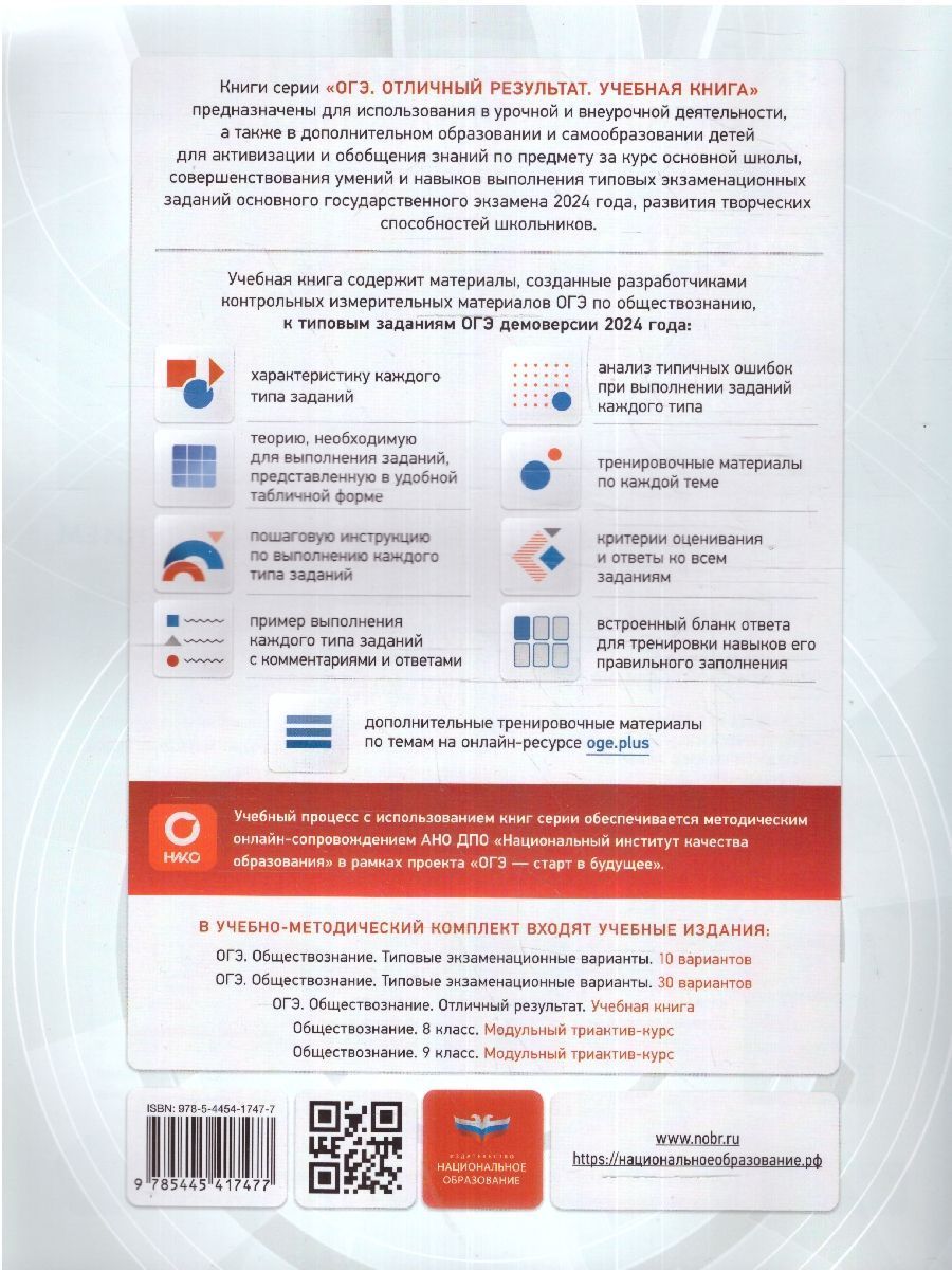 ОГЭ-2024 Обществознание. Отличный результат. Учебная книга участника ОГЭ. Серия подготовлена разработчиками контрольных измерительных материалов (КИМ) основного государственного экзамена. Настоящее учебно-практическое пособие поможет выпускникам добиться оптимальных результатов на едином государственном экзамене 2024 года благодаря целенаправленной активизации знаний и умений, проработке пошаговых действий, необходимых для успешного выполнения каждого типового экзаменационного задания, и отработке навыков их самостоятельного применения.Характеристики