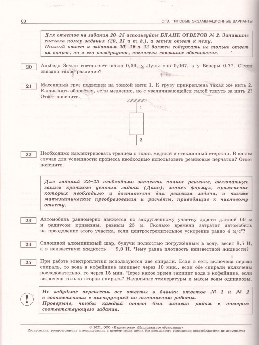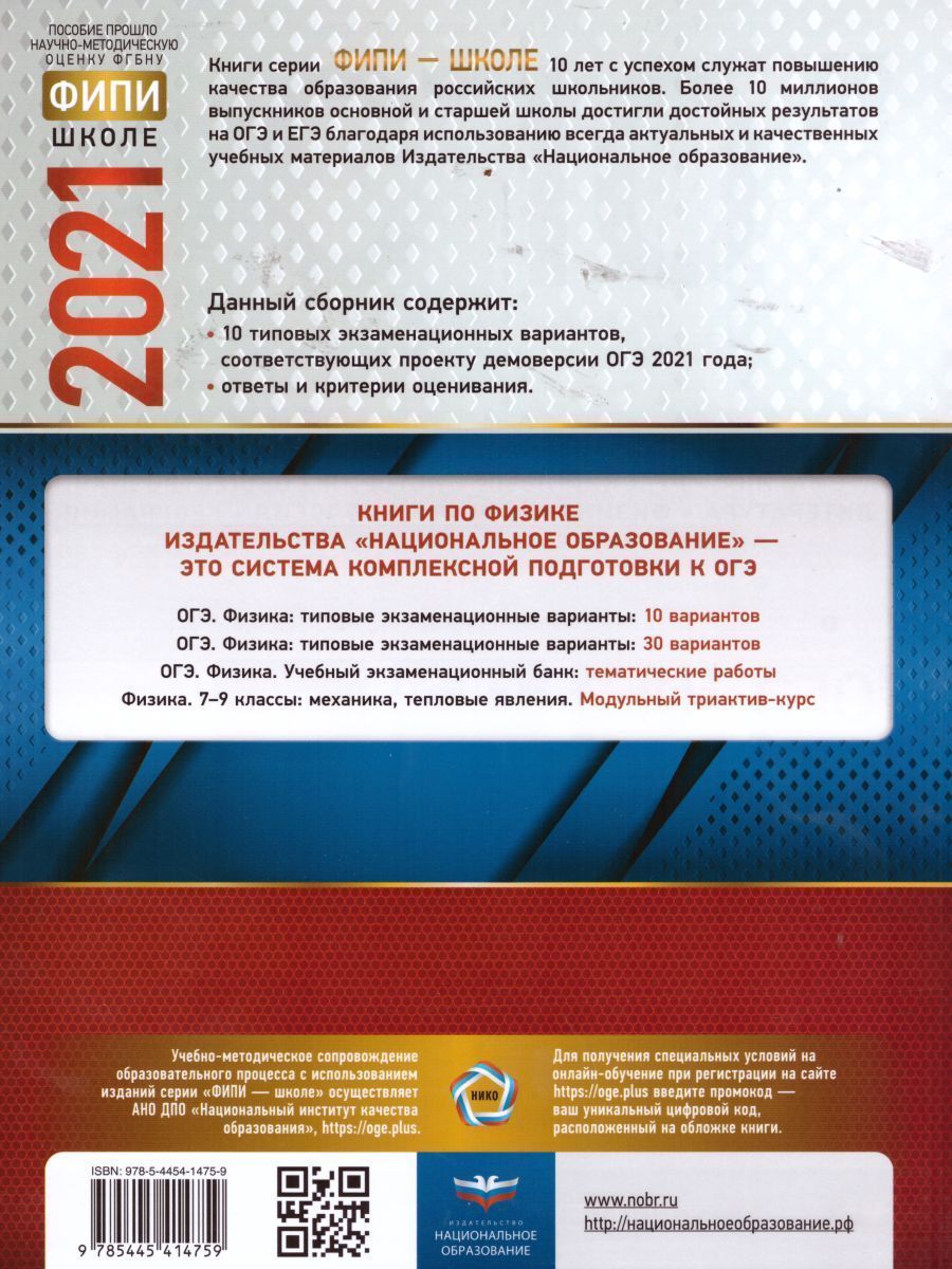 Пособие прошло научно-методическую оценку ФГБНУ «ФИПИ» Серия подготовлена разработчиками контрольных измерительных материалов (КИМ) основного государственного экзамена. В сборнике представлены: • 10 типовых экзаменационных вариантов, составленных в соответствии с проектом демоверсии КИМ ОГЭ по физике 2021 года; • инструкция по выполнению экзаменационной работы; • ответы ко всем заданиям; • решения и критерии оценивания заданий. Выполнение заданий типовых экзаменационных вариантов предоставляет обучающимся возможность самостоятельно подготовиться к государственной итоговой аттестации в 9 классе в форме ОГЭ, а также объективно оценить уровень своей подготовки к экзамену. Учителя могут использовать типовые экзаменационные варианты для организации контроля результатов освоения школьниками образовательных программ основного общего образования и интенсивной подготовки обучающихся к ОГЭ.Характеристики