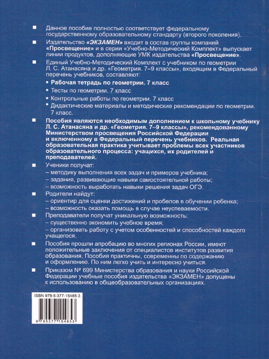 образовательному стандарту (второго поколения).Рабочая тетрадь для 7-го класса к учебнику Л. С. Атанасяна и др. "Геометрия. 7-9 классы" рекомендуется для организации учебной деятельности учащихся на уроках и дома.