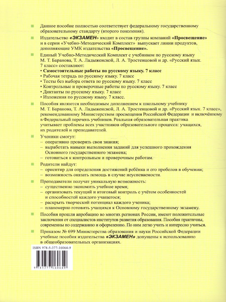 Данное пособие полностью соответствует федеральному государственному образовательному стандарту (второго поколения). Пособие содержит самостоятельные работы для текущего контроля знаний учащихся. Книга предназначена учащимся и учителям, работающим по учебнику М.Т. Баранова, Т.А. Ладыженской, Л.А. Тростенцовой и др. "Русский язык. 7 класс", имеющему гриф Министерства просвещения РФ и входящему в Федеральный перечень учебников.Характеристики