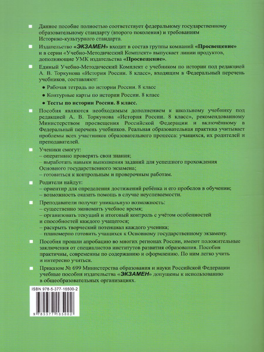 Данное пособие полностью соответствует федеральному государственному образовательному стандарту (второго поколения) и требованиям Историко-культурного стандарта. Пособие включает тесты по истории России и соответствует содержанию и структуре учебника "История России" под редакцией А.В. Торкунова (издательство "Просвещение") для 8 класса общеобразовательных организаций. Тесты, большинство из которых составлено по типу заданий Основного государственного экзамена (ОГЭ), можно использовать для обучения и самоконтроля учащихся, проверки домашних заданий, текущего и итогового контроля, а также постепенной подготовки к ОГЭ в 9 классе.Характеристики