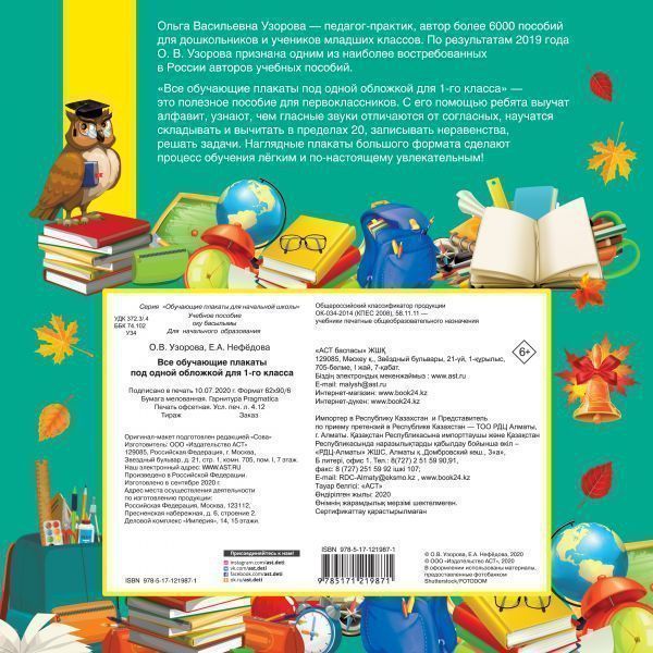 Все обучающие плакаты для 1 класса. Ольга Васильевна Узорова — педагог-практик, автор более 6000 учебных, методических и развивающих пособий для дошкольников и учеников младших классов. По результатам 2019 года О. В. Узорова признана одним из наиболее востребованных в России авторов учебных пособий. «Все обучающие плакаты для 1 класса» — это сборник плакатов для учеников начальной школы. В пособии наглядно представлен материал по наиболее важным темам, изучаемым школьниками в 1-м классе. Пользуясь обучающими плакатами, ребята научатся складывать и вычитать в пределах 20, узнают, что такое равенство и неравенство, выучат алфавит, усвоят правила правописания. Красочные плакаты большого формата подойдут как для занятий дома, так и для работы в классе. Для начального образования.Характеристики