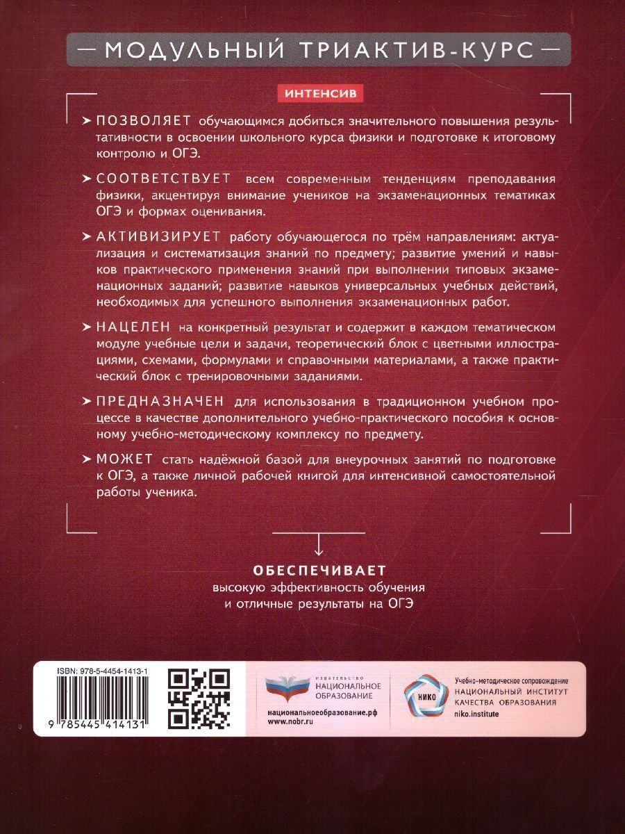 Модульный учебно-практический курс позволяет добиться значительного повышения результативности в освоении школьного курса физики и подготовке к итоговому контролю и ОГЭ. Материал издания активизирует работу обучающегося по трём направлениям: актуализация и систематизация знаний по предмету; развитие умений и навыков практического применения знаний при выполнении типовых экзаменационных заданий; формирование универсальных учебных действий, необходимых для успешного выполнения экзаменационных работ. Курс в целом и каждый его модуль нацелены на конкретный результат и содержат учебные цели и задачи, теоретический блок с цветными иллюстрациями, схемами и справочными материалами, практический блок с тренировочными заданиями, а также блок с итоговыми проверочными работами. Модульный триактив-курс предназначен для использования в учебном процессе в качестве дополнительного пособия к основному учебно-методическому комплексу по предмету; может стать надёжной базой для внеурочных занятий по подготовке к ОГЭ и ЕГЭ, а также личной рабочей книгой для интенсивной самостоятельной работы обучающегося.Характеристики