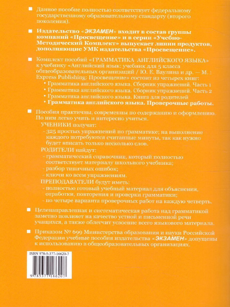 Данное пособие полностью соответствует федеральному государственному образовательному стандарту (второго поколения). Оно представляет собой четвёртую часть учебного комплекта, состоящего из четырёх книг: - Грамматика английского языка. Сборник упражнений. Часть I; - Грамматика английского языка. Сборник упражнений. Часть II; - Грамматика английского языка. Книга для родителей; - Грамматика английского языка. Проверочные работы. В пособие включены проверочные задания для контроля усвоения грамматического материала пятого класса. Проверка проводится в конце каждой четверти. Каждая работа имеет четыре варианта. Дома учащиеся готовятся к проверочной работе, просматривая все четыре варианта. На уроке преподаватель сообщает, какой именно вариант следует сделать. Учащиеся выполняют задания, вырезают страницу из книжки и сдают её на проверку. Мы намеренно не дали ключи к заданиям. Тем, кто систематически делал упражнения из СБОРНИКА, выполнить предлагаемые работы не составит труда. Если при подготовке всё же возникнут сложности, то прочитать соответствующее правило и найти ответ можно в КНИГЕ ДЛЯ РОДИТЕЛЕЙ. Номер соответствующего параграфа указан рядом с каждым заданием. Проверочные работы можно использовать и в дидактических целях. Для учащихся 5 класса, изучающих английский язык по учебнику Ю.Е. Ваулиной и др. "Английский язык. 5 класс".Характеристики