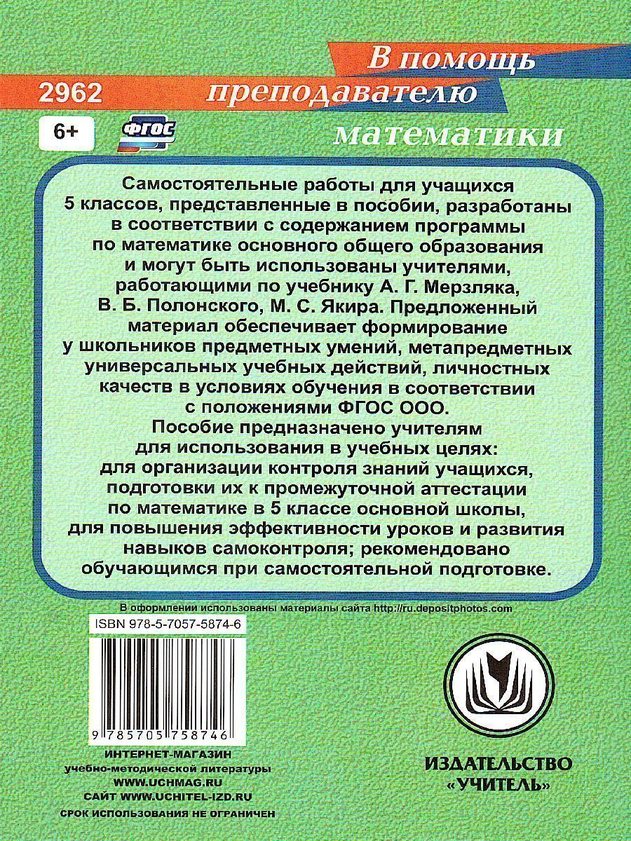 Самостоятельные работы для учащихся 5 классов, представленные в пособии, разработаны в соответствии с содержанием программы по математике основного общего образования и могут быть использованы учителями, работающими по учебнику А.Г. Мерзляка, В.Б. Полонского, М.С. Якира. Предложенный материал обеспечивает формирование у школьников предметных умений, метапредметных универсальных учебных действий, личностных качеств в условиях обучения в соответствии с положениями ФГОС ООО. Пособие предназначено учителям для использования в учебных целях: для организации контроля знаний учащихся, подготовки их к промежуточной аттестации по математике в 5 классе основной школы, для повышения эффективности уроков и развития навыков самоконтроля; рекомендовано обучающимся при самостоятельной подготовке.Характеристики