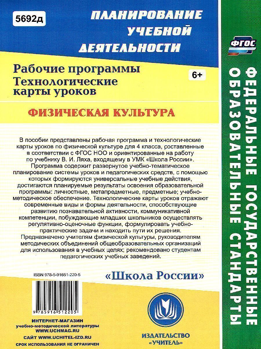 В пособии представлены рабочая программа и технологические карты уроков по физической культуре для 4 класса, составленные в соответствии с ФГОС НОО и ориентированные на работу по учебнику В.И. Ляха (М.: Просвещение), входящему в УМК "Школа России". Программа содержит развернутое учебно-тематическое планирование системы уроков и педагогических средств, с помощью которых формируются универсальные учебные действия, достигаются планируемые результаты освоения образовательной программы: личностные, метапредметные, предметные; учебно-методическое обеспечение. Технологические карты уроков отражают современные виды и формы деятельности, способствующие развитию познавательной активности, коммуникативной компетенции, побуждающие младших школьников осуществлять регулятивно-оценочные функции, формулировать учебно-практические задачи и находить пути их решения. Предназначено учителям физической культуры, руководителям методических объединений общеобразовательных организаций для использования в учебных целях; рекомендовано студентам педагогических учебных заведений.Характеристики