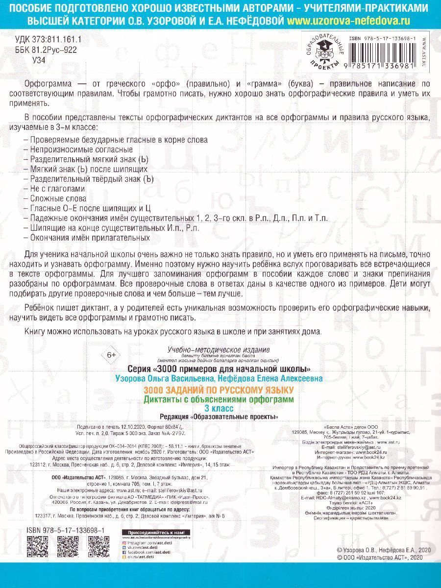 В пособии представлены тексты орфографических диктантов на все орфограммы и правила русского языка, изучаемые в 3-м классе: – Проверяемые безударные гласные в корне слова; – Непроизносимые согласные; – Разделительный мягкий знак (Ь); – Мягкий знак (Ь) после шипящих; – Разделительный твёрдый знак (Ъ); – Не с глаголами; – Сложные слова; – Гласные О-Е после шипящих и Ц; – Падежные окончания имён существительных 1, 2, 3-го скл. в Р.п., Д.п., П.п.; – Шипящие на конце существительных И.п., Р.п.; – Окончания имён прилагательных. Для ученика начальной школы очень важно не только знать правило, но и уметь его применять на письме, точно находить и узнавать орфограмму. Именно поэтому нужно научить ребёнка вслух проговаривать все встречающиеся в тексте орфограммы. Для лучшего запоминания орфограмм в пособии каждое слово и знаки препинания разобраны по орфограммам. Все проверочные слова в ответах даны в качестве одного из примеров. Дети могут подбирать другие проверочные слова, и чем больше – тем лучше. Книгу можно использовать на уроках русского языка в школе и при занятиях домаХарактеристики