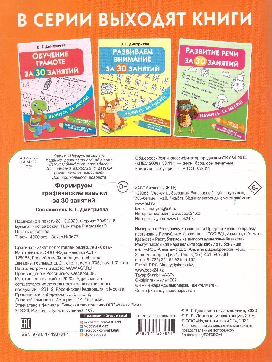 На страницах пособия "Формируем графические навыки за 30 занятий" дошкольники научатся ориентироваться на листе бумаги, разовьют мелкую моторику — потренируются проводить линии, выполнять задания по штриховке и дорисовке, обводить орнаменты по клеточкам. Материал изложен в простой, доступной форме и строится по принципу "Одна страница — одно занятие". Сборник представляет собой рабочую тетрадь для формирования графических навыков, развития мелкой моторики и подготовки руки к письму. Для дошкольного возраста.Характеристики