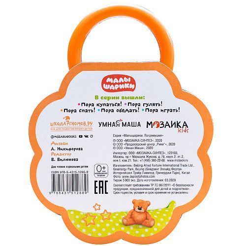 Динь-динь-бом! Как привлечь внимание ребенка к книжке даже в самом раннем возрасте? Яркая книжка-погремушка с очаровательным Ежиком на обложке гремит, если ее потрясти. Малыш будет с удовольствием играть с привычной игрушкой — погремушкой и заодно заинтересуется яркими картинками внутри книжки. Книга «Пора спать!» из серии «Малышарики. Погремушки» предназначена для знакомства с окружающим миром, развития речи и мышления у самых маленьких. В книге ребенок найдет 9 красочных фотографий предметов, окружающих его во время подготовки ко сну (кроватка, подушка, одеяло, пижама, ночник и пр.). Рассматривая их, малыш познакомится с полезными предметами и пополнит свой словарный запас. Книга-игрушка изготовлена из плотного картона и безопасной пены EVA, имеет удобный формат — ее легко держать в руках, можно взять в поездку или в гости.Характеристики