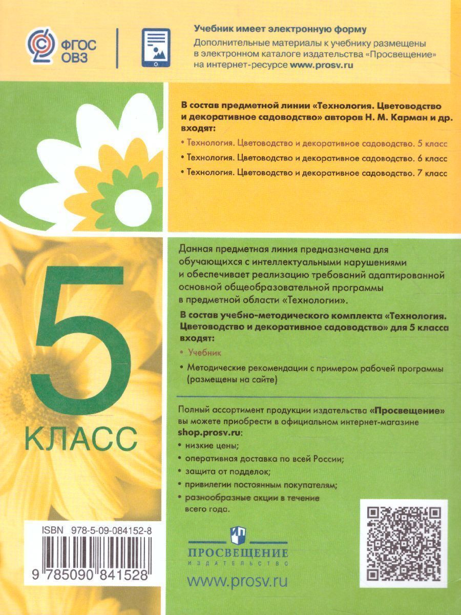 Учебник предназначен для детей с ограниченными возможностями здоровья и реализует требования адаптированной основной общеобразовательной программы в предметной области «Технологии» в соответствии с ФГОС образования обучающихся с интеллектуальными нарушениями. Учебник имеет практико-ориентированную направленность. Он познакомит учащихся с профессиями озеленителя и цветовода, поможет сформировать у детей интерес к занятиям цветоводством и декоративным садоводством, научит правильно ухаживать за комнатными и цветочными растениями, расскажет о классификации цветочно-декоративных культур и основных видах цветников, об особенностях однолетних цветочных растений и агротехнике их выращивания, об использовании однолетних растений для цветочного оформления улиц и помещений. Учащиеся узнают, какие цветы и растения можно высадить на балконе, около дома на клумбе или на пришкольном участке, как правильно использовать ручной инвентарь и какие правила нужно соблюдать при работе с ним. Вопросы и задания в конце каждой темы помогут повторить и закрепить изученный материал. Выполняя практические работы, учащиеся научатся собирать семена однолетних цветочных растений, вскапывать почву для посадок, выращивать садовые и комнатные цветочные растения, составлять букеты для подарка родным и друзьям. Учебник содержит много творческих заданий, которые учащимся будет интересно выполнять самостоятельно. Все темы уроков и практические работы иллюстрированы большим количеством рисунковХарактеристики
