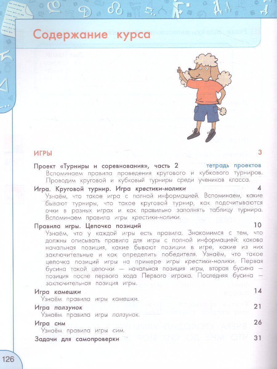 В обновлённом учебно-методическом комплекте сохранился учебный план курса и порядок изучаемых тем, но добавилось несколько важных задачных линий, а именно: • задачи о равенстве геометрических фигур и сравнении их наложением, • задачи об определении времени по аналоговым (циферблат со стрелками) и цифровым (циферблат с числами) часам, • задачи на построение и исследование столбчатых диаграмм. В конце каждого учебника добавлена рубрика «Проверь себя».Характеристики