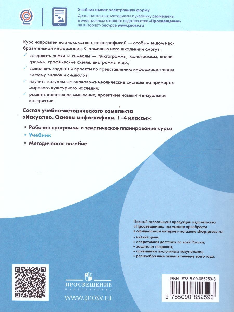 Учебник адресован учащимся начальной школы, которые интересуются инфографикой и стремятся постичь её основы. Дети узнают, что такое инфографика и почему она так актуальна сегодня, где «живёт инфографика», а также познакомятся с разными средствами инфографики, с тем, что такое пиктограмма, монограмма, каллиграмма и т. д. Ребята научатся самостоятельно создавать практические творческие работы и оригинальные проекты по инфографике. Каждая тема включает краткий и образный учебный текст, а также практические творческие задания, которые учат овладевать различными графическими материалами, инструментами и техниками. Учебник включает примеры инфографики, созданные лучшими графическими дизайнерами, произведения изобразительного искусства, методические рисунки-подсказки, фотографии (с изображением процесса работы), а также варианты детских работ.Характеристики