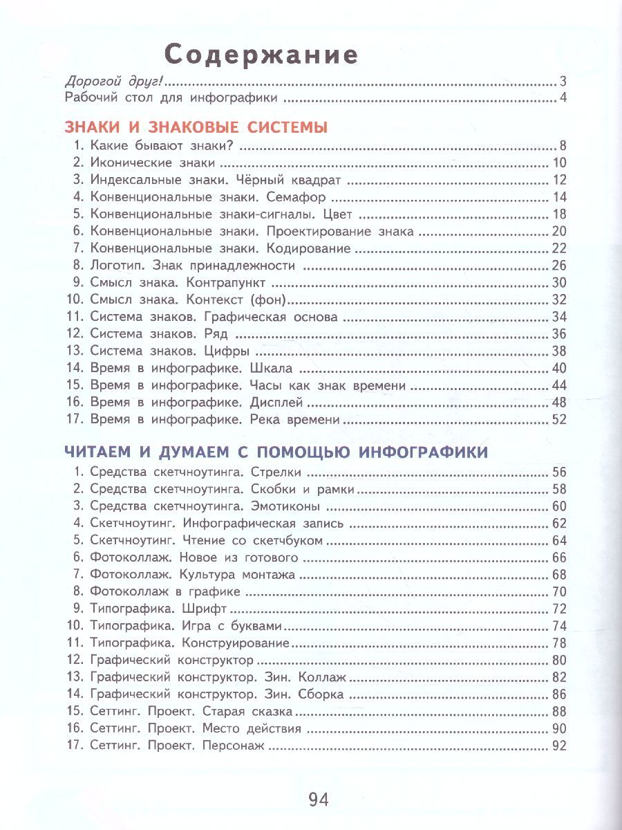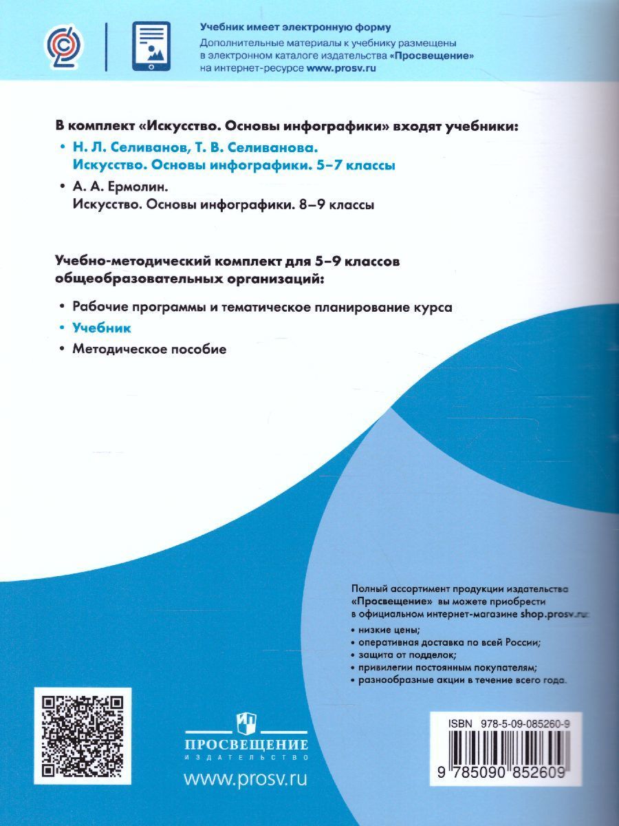Учебник адресован учащимся основной школы, которые интересуются инфографикой Учебник познакомит с тремя видами знаков (иконическими, индексальными, конвенциональными), их особенностями и выразительными возможностями, а также расскажет о том, как сделать инфографику помощницей в процессе обучения. Учащиеся узнают, что такое скетчноутинг, фотоколлаж, типографика и в чём их особенности. Каждая тема включает краткий и образный учебный текст, разнообразный зрительный ряд и практические творческие задания, которые способствуют развитию интеллектуальных способностей и художественного мышления, формированию умения владеть различными материалами, инструментами и техниками.Характеристики