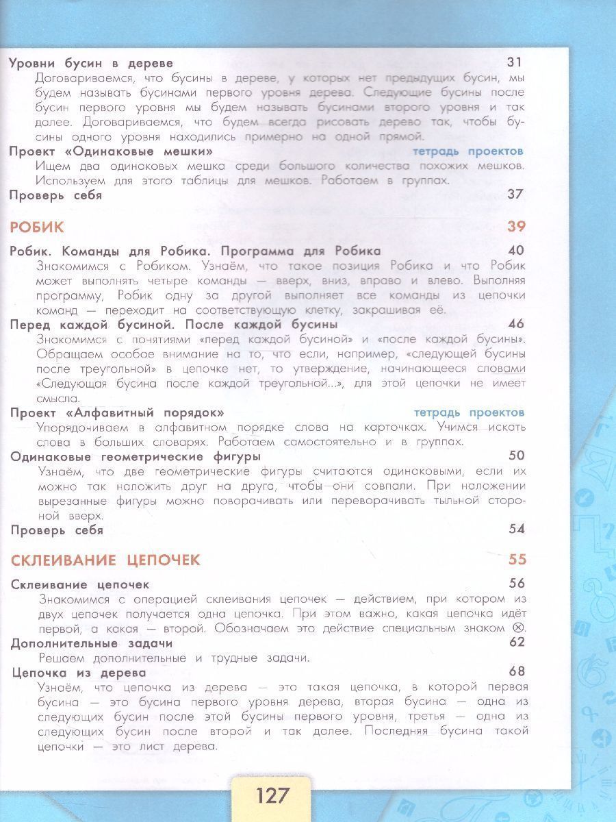 Курс «Информатика» рассчитан на обучение в те че ние двух или трёх лет в объёме 34–68 ч в год. Программа курса предусматривает несколько различных вариантов работы с ним, в том числе как с использованием средств ИКТ, так и бескомпьютерный вариант. В материалы каждой части курса входят учебник, рабочая тетрадь, тетрадь проектов, компьютерная составляющая и методическое пособие для учителя.Характеристики