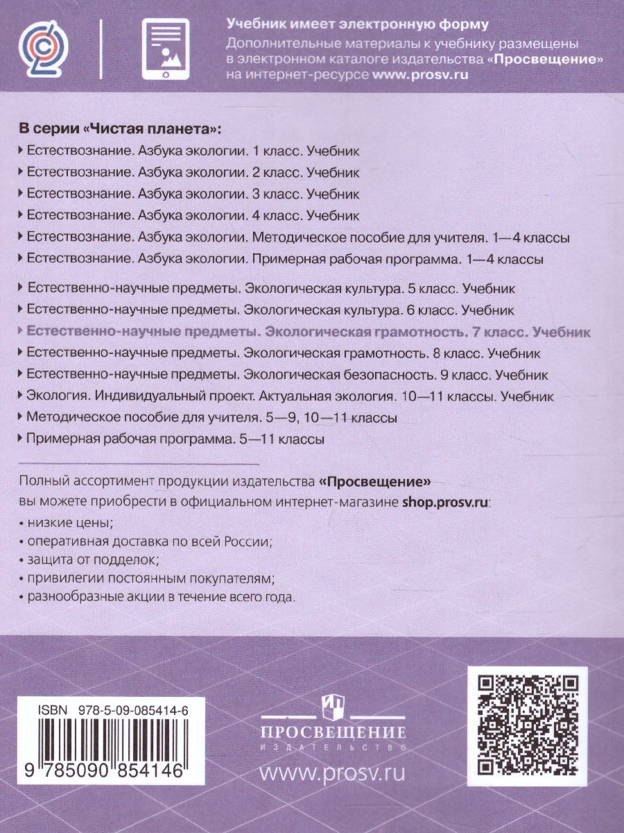 Предлагаемый учебник — основной элемент информационно-образовательной среды предметной линии УМК по естественно-научным предметам «Чистая планета» для 7 класса. В нём рассмотрены вопросы о проблемах сохранения биоразно- образия, почвы и энергии, о взаимосвязях в природе и научно обоснованном при- родопользовании. Учебник выполняет функцию одного из инструментов достижения образова- тельных результатов (личностных, метапредметных и предметных) по естественно- научным предметам в соответствии с требованиями Федерального государственно- го образовательного стандарта основного общего образования. Учебный материал, приведённый в учебнике, с одной стороны, опирается на полученные ранее знания обучающихся, с другой стороны, значительно расширяет кругозор школьников по каждой теме; содержание учебника обеспечивает сопровождение образовательной деятельности учащихся в разных формах: практической работы, учебном проекте, учебном исследовании, учебной экскурсии. Обобщение знаний происходит при вы- полнении заданий на формирование функциональной грамотности обучающихся.Характеристики