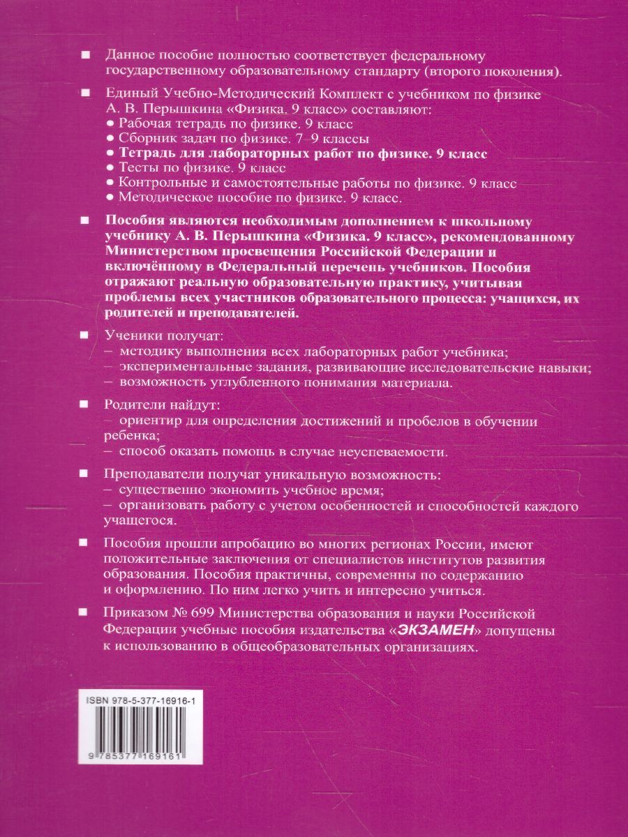 Данное пособие полностью соответствует федеральному государственному образовательному стандарту (второго поколения). Тетрадь для лабораторных работ предназначена для изучающих физику по учебнику А. В. Перышкина Физика. 9 класс. В каждой работе указаны цели ее проведения, необходимое оборудование, приведено описание хода работы с рисунками, таблицами и расчетными формулами. Звездочкой помечены вопросы повышенной сложности. Часть стандартных лабораторных работ содержат дополнительные задания.Характеристики