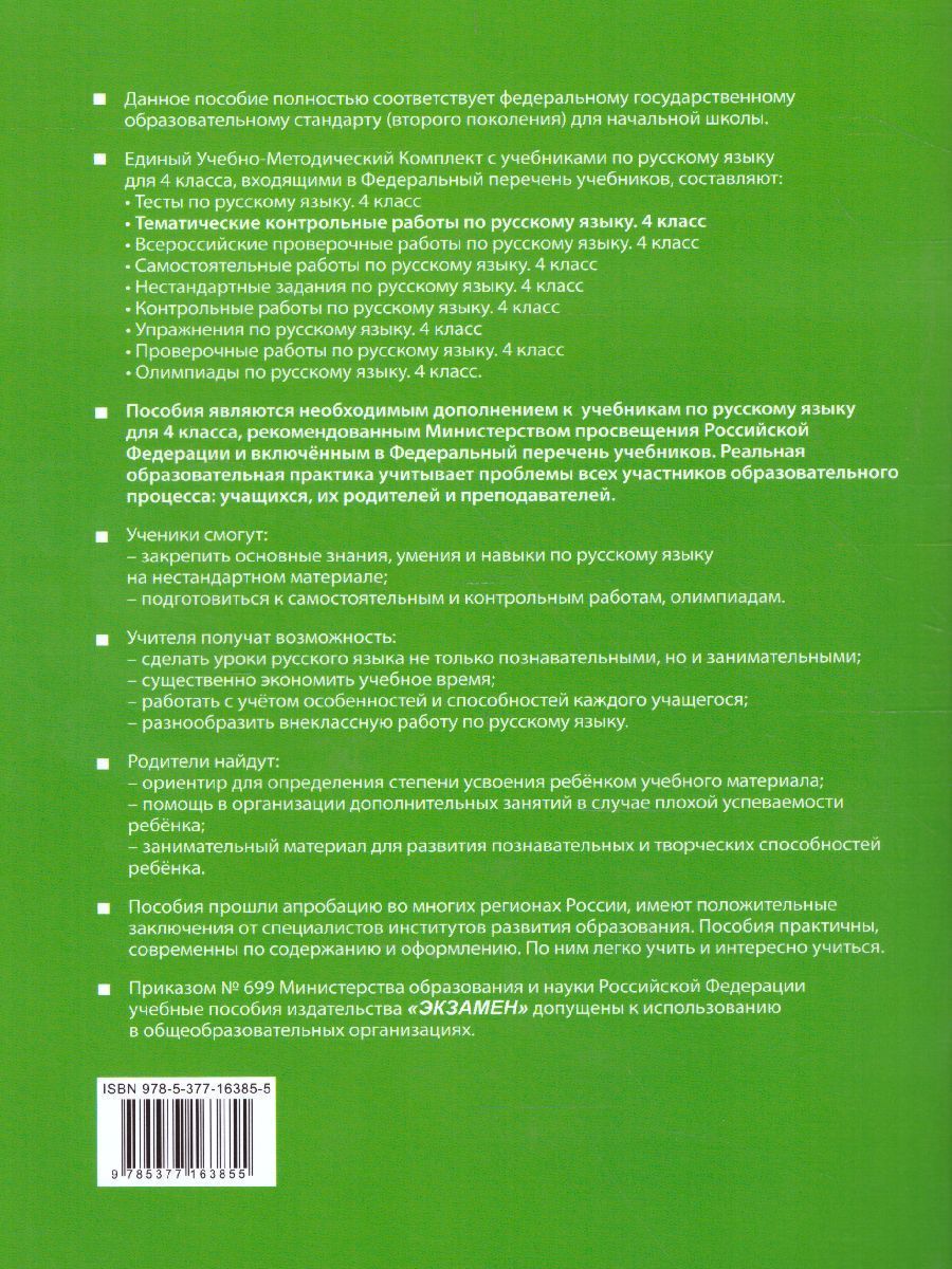 Данное пособие полностью соответствует федеральному государственному образовательному стандарту (второго поколения) для начальной школы. Пособие включает тематические контрольные работы по русскому языку для 4 класса. Итоговые контрольные работы по темам и итоговые контрольные работы с текстом позволяют, начиная с 1 четверти, готовиться к итоговой аттестации за курс начальной школы, а также к Всероссийской проверочной работе. Пособие можно использовать при работе с любым учебником, рекомендованным Министерством просвещения РФ и включённым в Федеральный перечень учебников.Характеристики