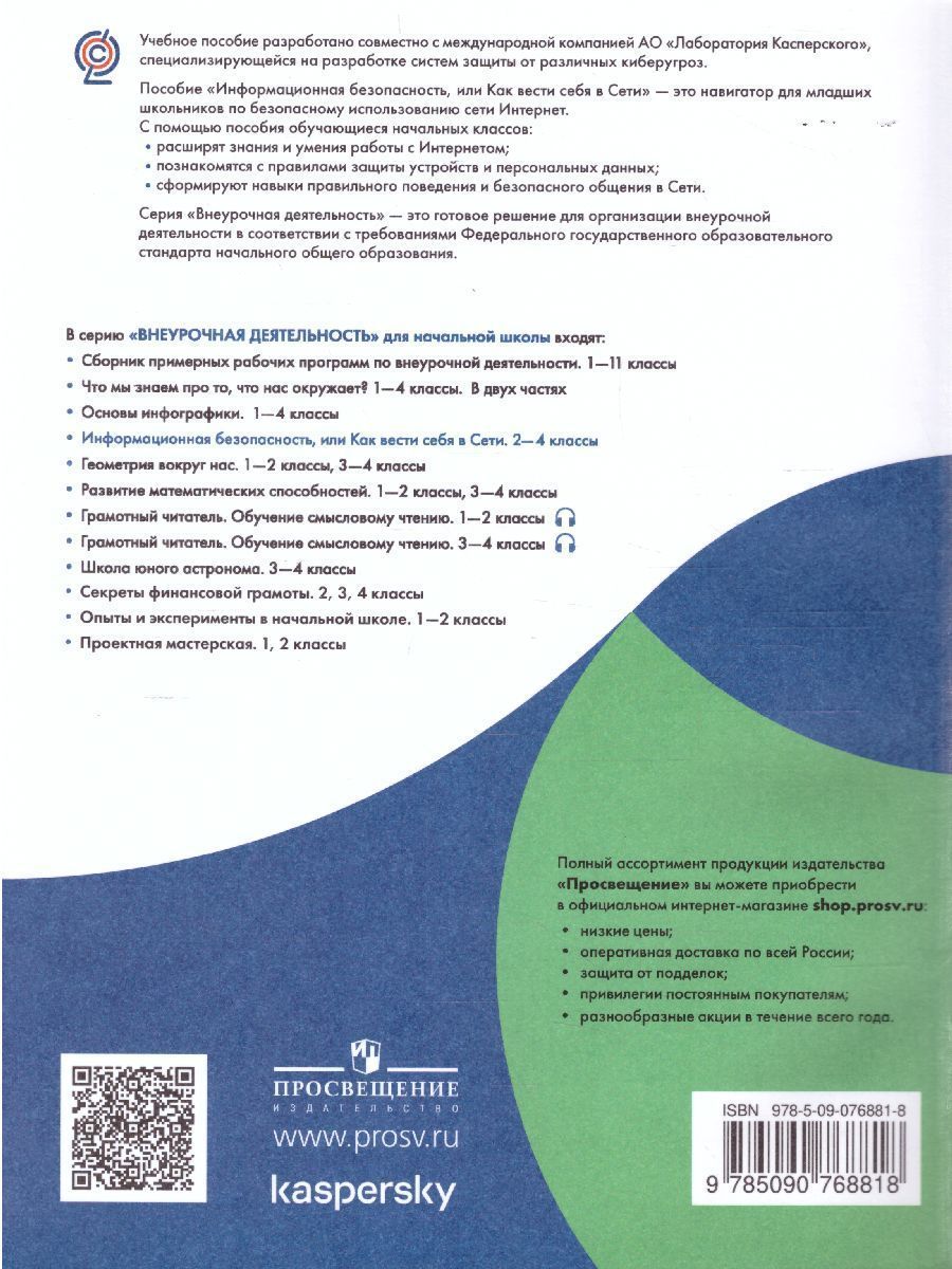 Данное пособие предназначено для организации внеурочной деятельности по общеинтеллектуальному развитию обучающихся в начальной школе. Содержание пособия расширит систему знаний и навыков работы с Интернетом, познакомит школьников с правилами защиты устройств и личной информации, безопасного общения в Сети. С помощью пособия, обучающиеся узнают, как вести себя, столкнувшись с кибербуллингом и как избежать фишинга. В пособии содержатся разнообразные задания, выполнение которых не только способствует освоению материала курса, но и развивает у обучающихся начальной школы коммуникативные навыки, умение работать в команде, умение критически осмысливать возникающие ситуации и предложенные задачи, навыки проектной деятельности. Пособие адресовано учащимся 2 – 4 классов.Характеристики