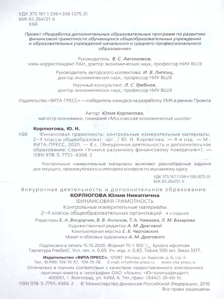 Финансовая грамотность: контрольные измерительные материалы. 2 – 4 классы (ВИТА)