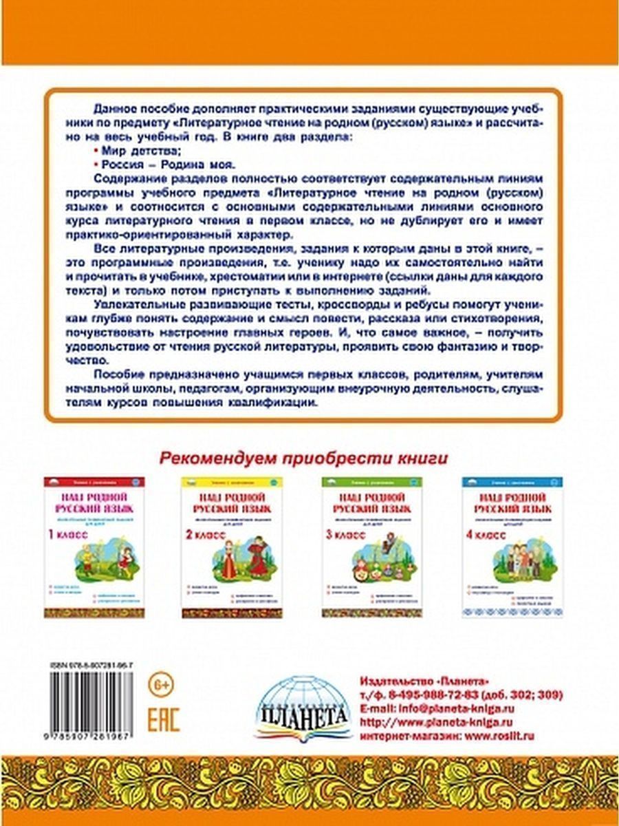 Данное пособие дополняет практическими заданиями существующие учебники по предмету «Литературное чтение на родном (русском) языке» и рассчитано на весь учебный год. В книге два раздела: • Мир детства; • Россия – Родина моя. Содержание разделов полностью соответствует содержательным линиям программы учебного предмета «Литературное чтение на родном (русском) языке» и соотносится с основными содержательными линиями основного курса литературного чтения в первом классе, но не дублирует его и имеет практико-ориентированный характер. Все литературные произведения, задания к которым даны в этой книге, – это программные произведения, т.е. ученику надо их самостоятельно найти и прочитать в учебнике, хрестоматии или в интернете (ссылки даны для каждого текста) и только потом приступать к выполнению заданий. Увлекательные развивающие тесты, кроссворды и ребусы помогут ученикам глубже понять содержание и смысл повести, рассказа или стихотворения, почувствовать настроение главных героев. И, что самое важное, – получить удовольствие от чтения русской литературы, проявить свою фантазию и творчество. Пособие предназначено учащимся первых классов, родителям, учителям начальной школы, педагогам, организующим внеурочную деятельность, слушателям курсов повышения квалификации.Характеристики