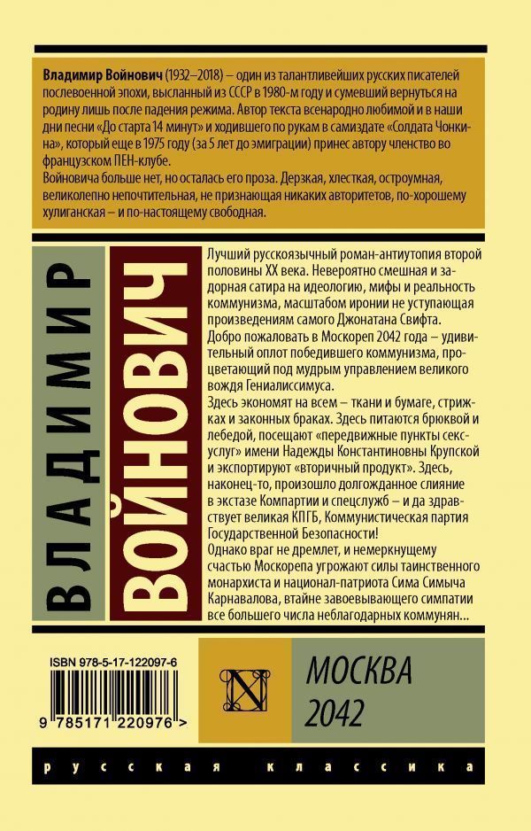 Лучший русскоязычный роман-антиутопия второй половины ХХ века. Невероятно смешная и задорная сатира на идеологию, мифы и реальность коммунизма, масштабом иронии не уступающая произведениям самого Джонатана Свифта. Добро пожаловать в Москореп 2042 года — удивительный оплот победившего коммунизма, процветающий под мудрым управлением великого вождя Гениалиссимуса. Здесь экономят на всем — ткани и бумаге, стрижках и законных браках. Здесь питаются брюквой и лебедой, посещают "передвижные пункты секс-услуг" имени Надежды Константиновны Крупской и экспортируют "вторичный продукт". Здесь, наконец-то, произошло долгожданное слияние в экстазе Компартии и спецслужб — и да здравствует великая КПГБ, Коммунистическая партия Государственной Безопасности! Однако враг не дремлет, и немеркнущему счастью Москорепа угрожают силы таинственного монархиста и национал-патриота Сима Симыча Карнавалова, втайне завоевывающего симпатии все большего числа неблагодарных коммунян.Характеристики