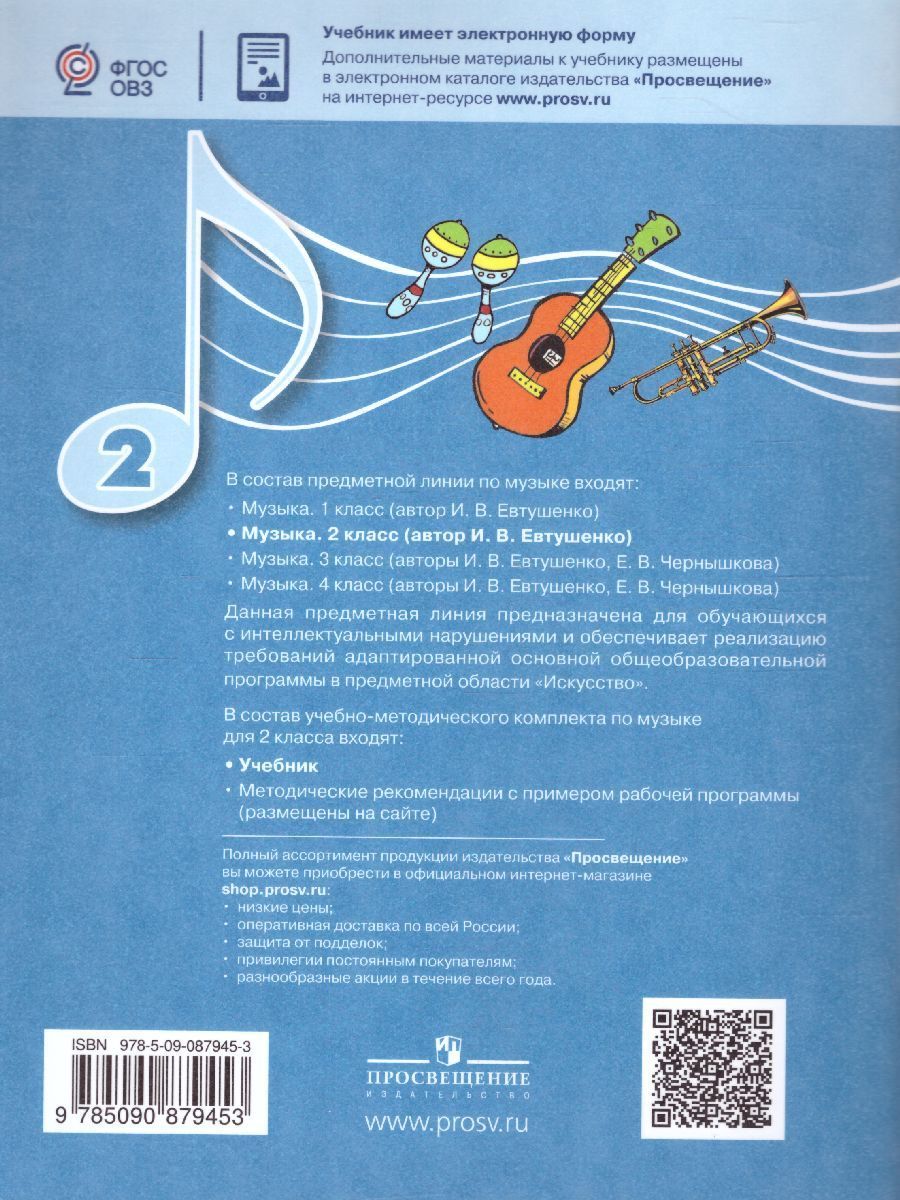 Учебник предназначен для детей с ограниченными возможностями здоровья и обеспечивает реализацию требований адаптированной основной общеобразовательной программы в предметной области «Искусство» в соответствии с ФГОС образования обучающихся с интеллектуальными нарушениями. Содержание учебника направлено на формирование устойчивого интереса к музыке и развитие музыкальных способностей обучающихся. Во втором классе дети продолжат овладевать различными видами музыкальной деятельности: хоровым и сольным пением, интонированием и передачей ритмического рисунка мелодии; слушать и определять характер разнообразных по содержанию музыкальных произведений; знакомиться с музыкальными инструментами и их звучанием.Характеристики