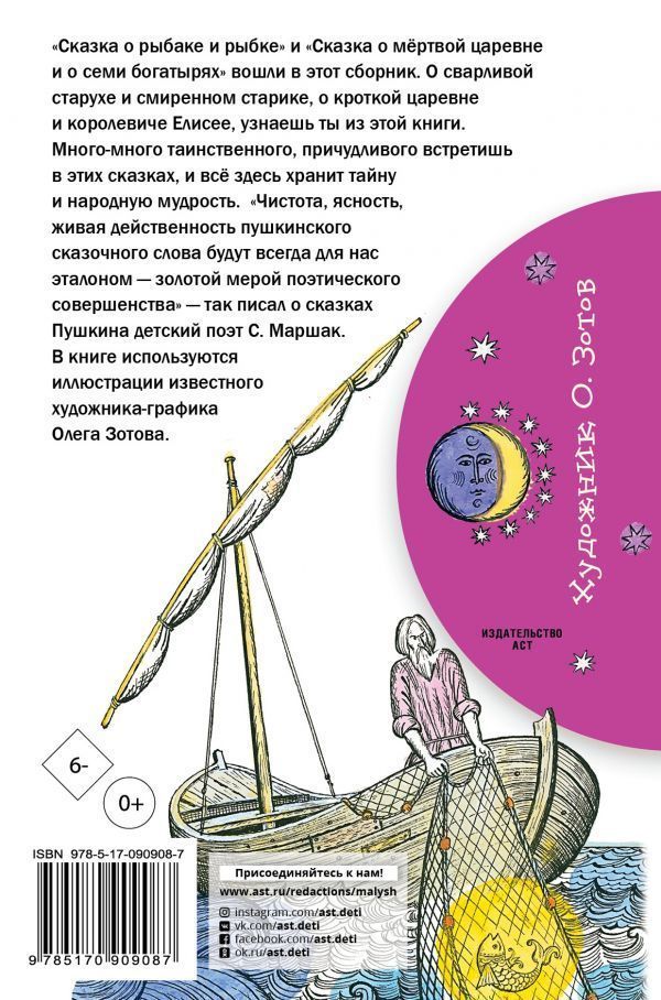 В книгу вошли две сказки А.С. Пушкина - "Сказка о рыбаке и рыбке" и "Сказка о спящей царевне и о семи богатырях" с классическими иллюстрациями художника-графика Олега Зотова. Рисунки к "Сказке о рыбаке и рыбке" были отмечены "Золотым яблоком" на Международном биеннале в 1981 году. Для младшего школьного возраста.Характеристики