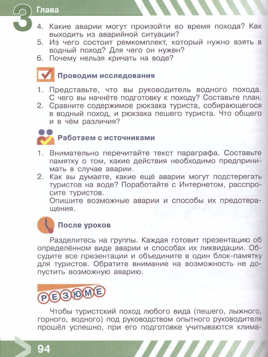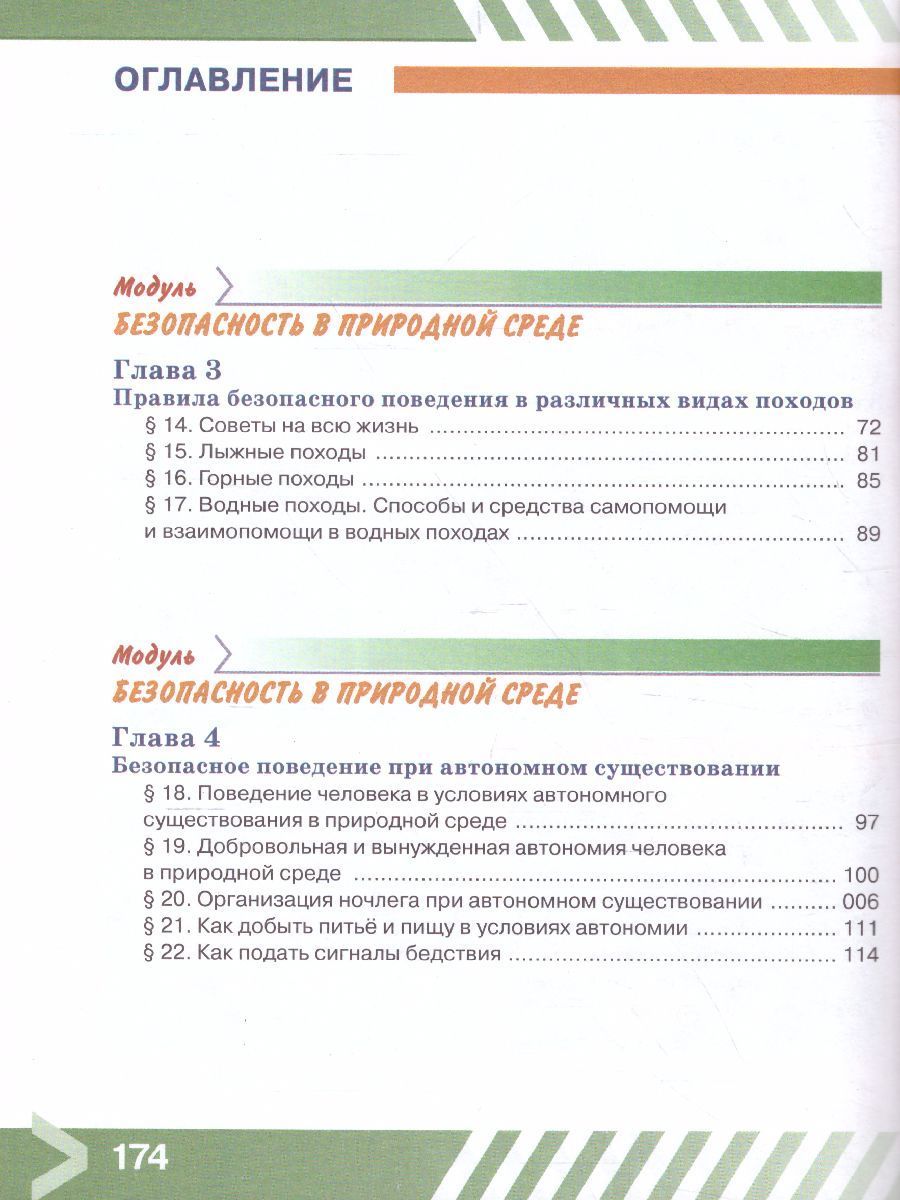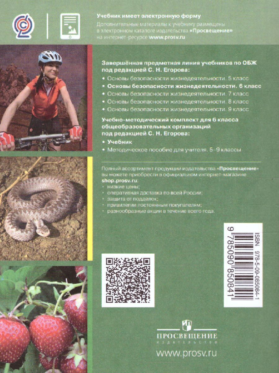С помощью учебника учащиеся смогут освоить правила безопасного поведения на природе, в различных видах туристских походов (пеших, водных, лыжных, горных, велосипедных), при автономном существовании в природных условиях, получат представление, какие воспитательные, оздоровительные и познавательные задачи решает туризм, при непосредственном вступлении в контакт с окружающей средой. Шестиклассники узнают, как добывать питьё и пищу, находясь на природе, как подавать сигналы бедствия, как вести себя при встрече с дикими животными и змеями, при нападении насекомых и клещей. Важное внимание уделено правилам оказания первой помощи пострадавшему при получении травматических повреждений. Учащиеся получат информацию, что такое вредные привычки и в чём их опасность для организма, узнают об опасности заболевания игроманией, получат рекомендации, как бороться с избыточной массой тела.Характеристики