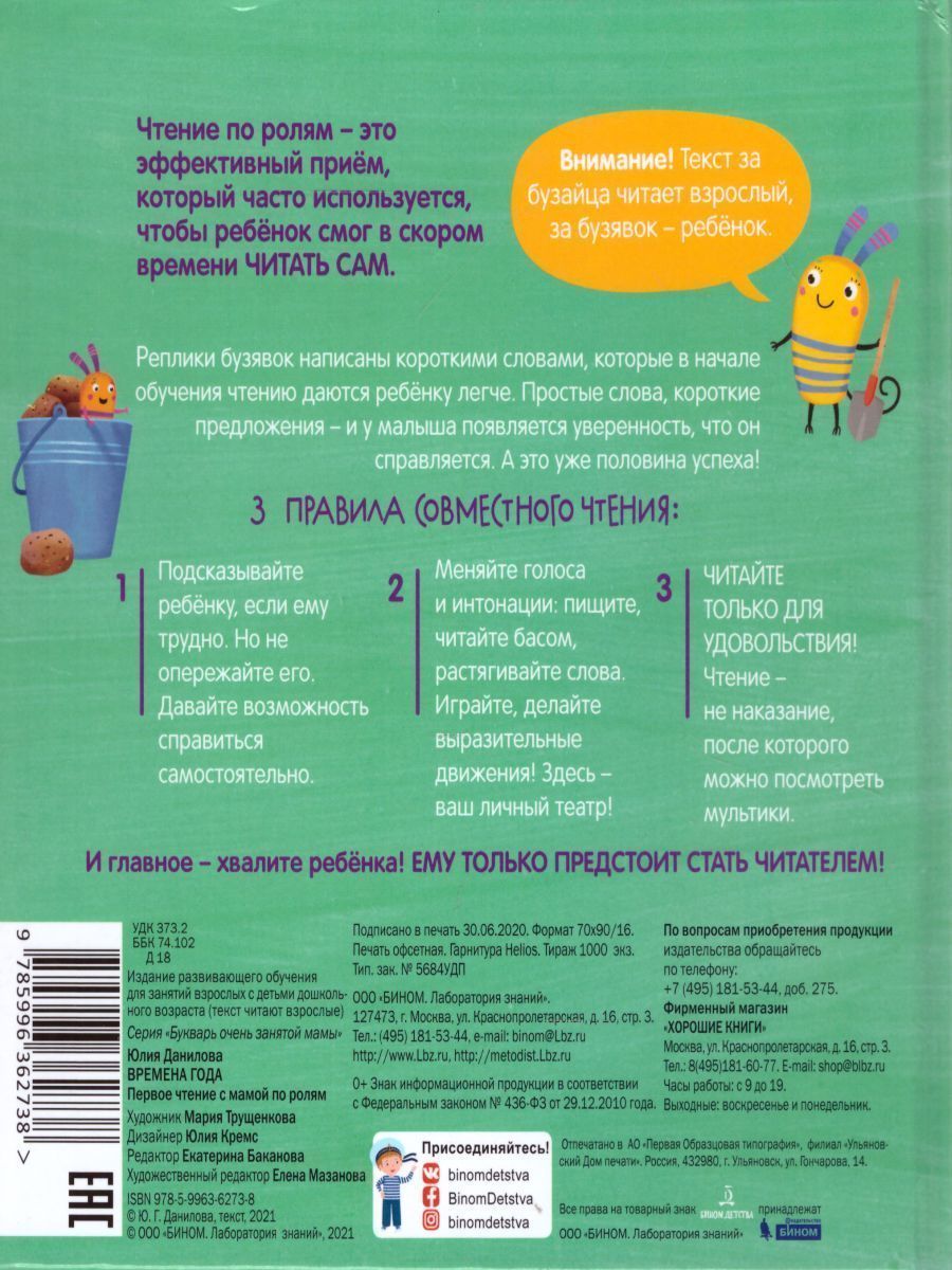 "Первое чтение с мамой по ролям" - это восемь маленьких книжечек, которые входят в комплект "Букварь очень занятой мамы". Ребята снова встретятся с бузайцами и познакомятся с маленькими непоседами-бузявками. Бузявки свалились на Землю с Луны, совсем ничего не знают и все путают. Совсем как наши малыши. Вместе смеемся над их приключениями и незаметно осваиваем навык самостоятельного чтения. Чтение по ролям – это эффективный прием, который часто используется, чтобы ребёнок смог в скором времени ЧИТАТЬ САМ. Текст за бузайца читает взрослый, за бузявок – ребенок.Характеристики