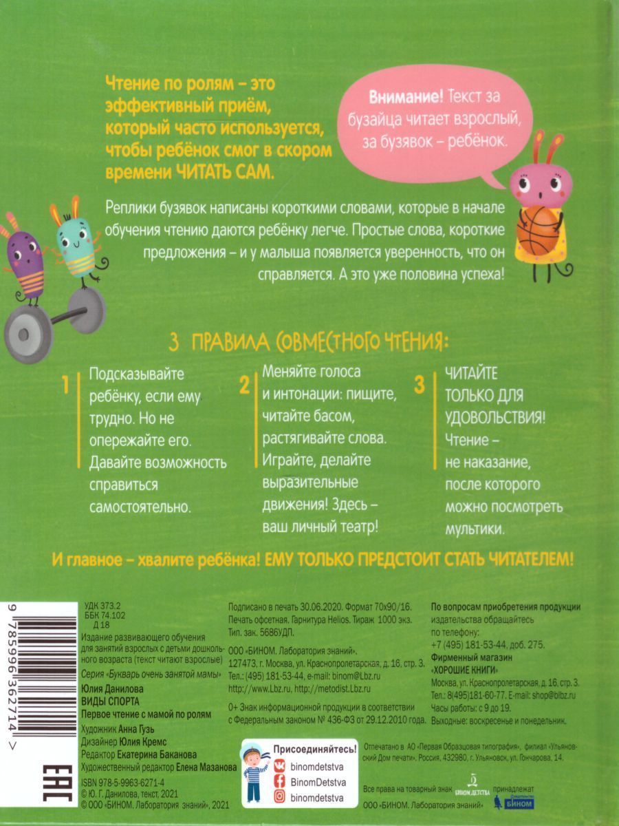 "Первое чтение с мамой по ролям" - это восемь маленьких книжечек, которые входят в комплект Юлии Даниловой "Букварь очень занятой мамы". Ребята снова встретятся с бузайцами и познакомятся с маленькими непоседами-бузявками. Бузявки свалились на Землю с Луны, совсем ничего не знают и все путают. Совсем как наши малыши. Давайте вместе посмеемся над их приключениями и незаметно осваоим навык самостоятельного чтения. Чтение по ролям - это эффективный приём, который часто используется, чтобы ребёнок смог в скором времени ЧИТАТЬ САМ. Текст за бузайца читает взрослый, за бузявок - ребёнок. Реплики бузявок написаны короткими словами с преимущественно закрытыми слогами, которые в начале обучения чтению даются ребёнку легче. Простые слова, короткие предложения - и у малыша появляется уверенность, что он справляется. А это уже половина успеха!Характеристики