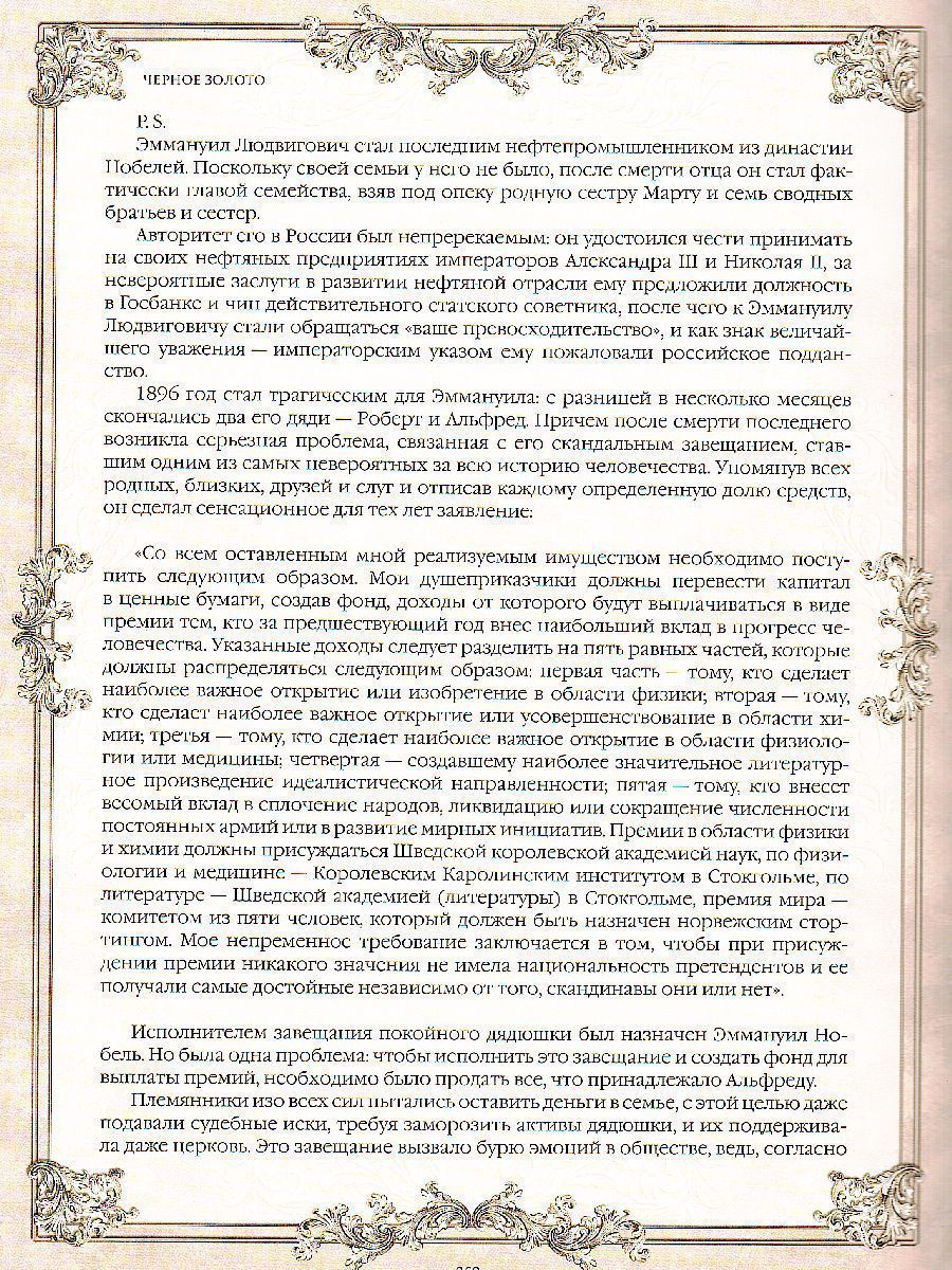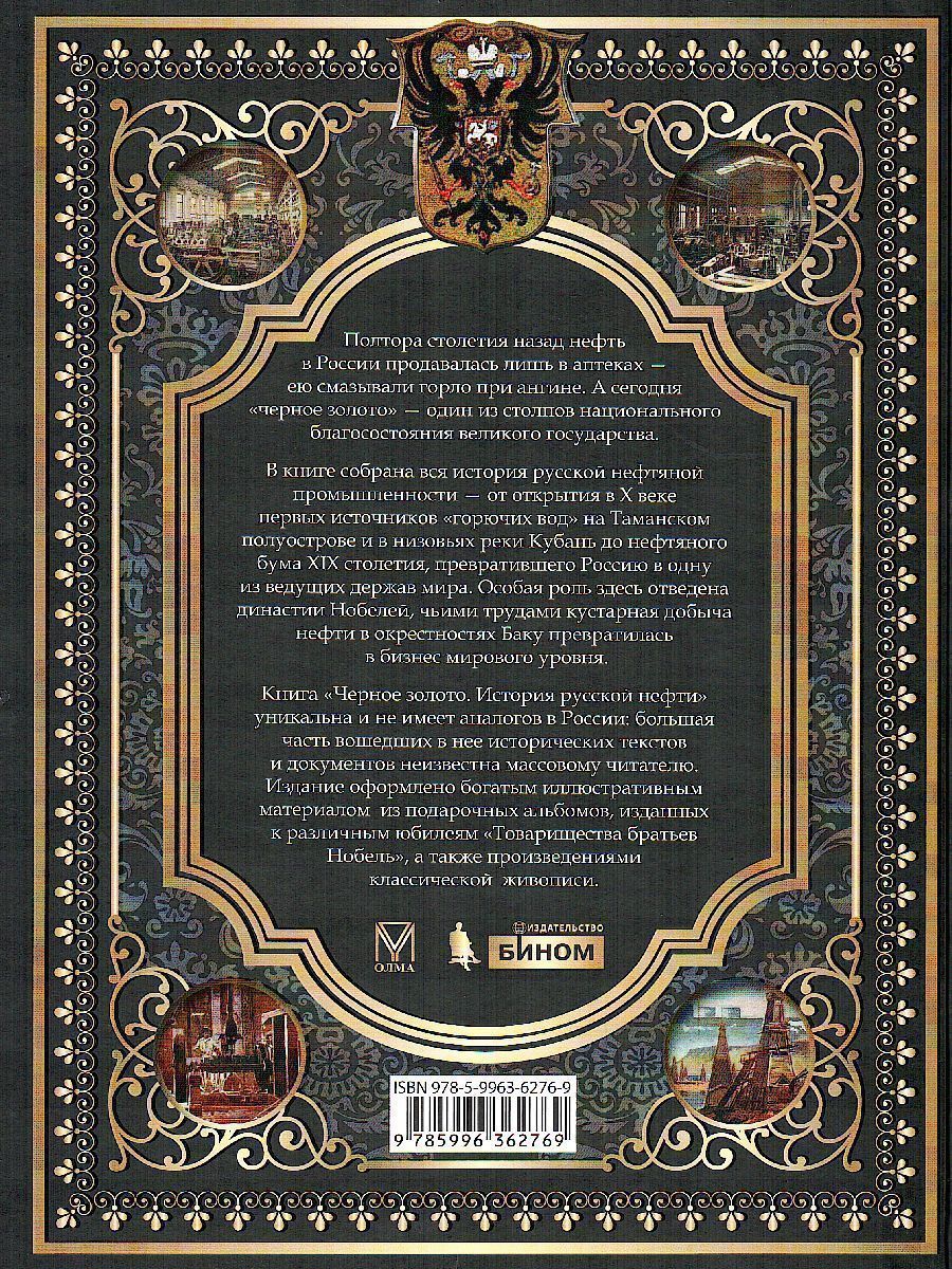 Полтора столетия назад нефть в России продавалась лишь в аптеках - ею смазывали горло при ангине. А сегодня "черное золото" - один из столпов национального благосостояния великого государства. В книге собрана вся история русской нефтяной промышленности - от открытия в X веке первых источников "горючих вод" на Таманском полуострове и в низовьях реки Кубань до нефтяного бума XIX столетия, превратившего Россию в одну из ведущих держав мира. Особая роль здесь отведена династии Нобелей, чьими трудами кустарная добыча нефти в окрестностях Баку превратилась в бизнес мирового уровня. Книга "Черное золото. История русской нефти" уникальна и не имеет аналогов в России: большая часть вошедших в нее исторических текстов и документов неизвестна массовому читателю. Издание оформлено богатым иллюстративным материалом. из подарочных альбомов, изданных к различным юбилеям "Товарищества братьев Нобель", а также произведениями классической живописи.Характеристики