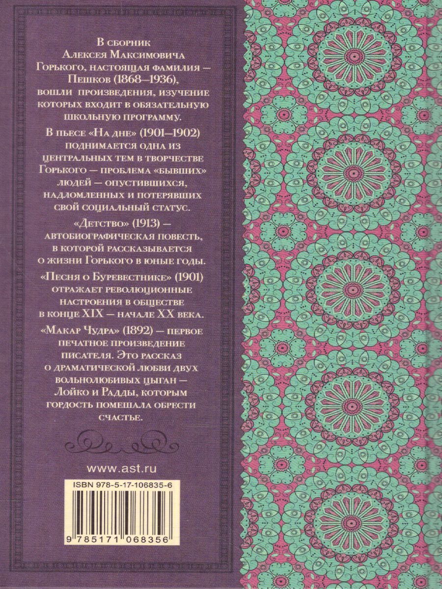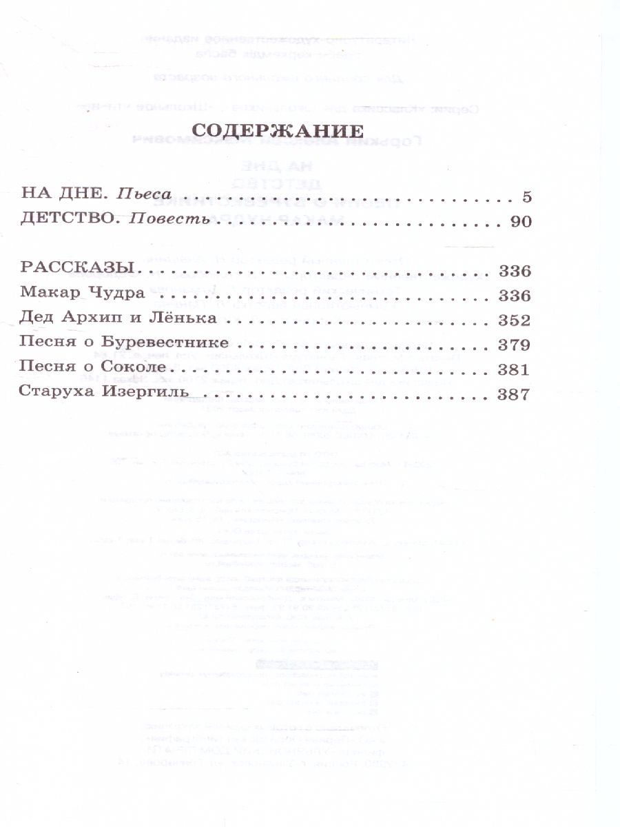 В сборник вошли произведения Алексея Максимовича Горького (1868 – 1936, настоящая фамилия – Пешков), изучение которых входит в обязательную школьную программу: пьеса «На дне», повесть «Детство», стихотворения «Песня о Буревестнике» и «Песня о Соколе», рассказы «Макар Чудра» и «Старуха Изергиль». В пьесе «На дне» (1901 – 1902) поднимается одна из центральных тем в творчестве Горького – проблема «бывших» людей – опустившихся, надломленных и потерявших свой социальный статус. «Детство» (1913) – автобиографическая повесть, в которой рассказывается о жизни Горького в юные годы. Детство писателя было очень тяжёлым: его счастливая жизнь с родителями закончилась после смерти отца, когда он переехал жить к скупому и жестокому деду. «Песня о Буревестнике» (1901) отражает революционные настроения в обществе в конце XIX – начале XX века. В стихотворении Горький призывал рабочий класс к борьбе с самодержавием. «Макар Чудра» (1892) – первое печатное произведение писателя. Это рассказ о драматической любви двух вольнолюбивых цыган – Лойко и Радды, которым гордость помешала обрести счастье.Характеристики