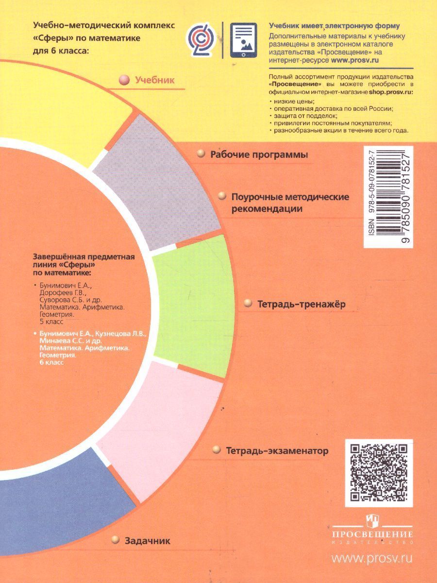 Данный учебник продолжает линию учебно-методических комплекcов по математике "Сферы". Издание подготовлено в соответствии с Федеральным государственным стандартом основного общего образования и освещает вопросы курса математики 6 класса. Содержательно материал учебника направлен на продолжение формирования центральных математических понятий (число, величина, геометрическая фигура), обеспечивающих преемственность и перспективность математического образования школьников. При его создании использованы концептуальные идеи учебника "Математика, 6" под редакцией Г.В. Дорофеева и И.Ф. Шарыгина.Характеристики