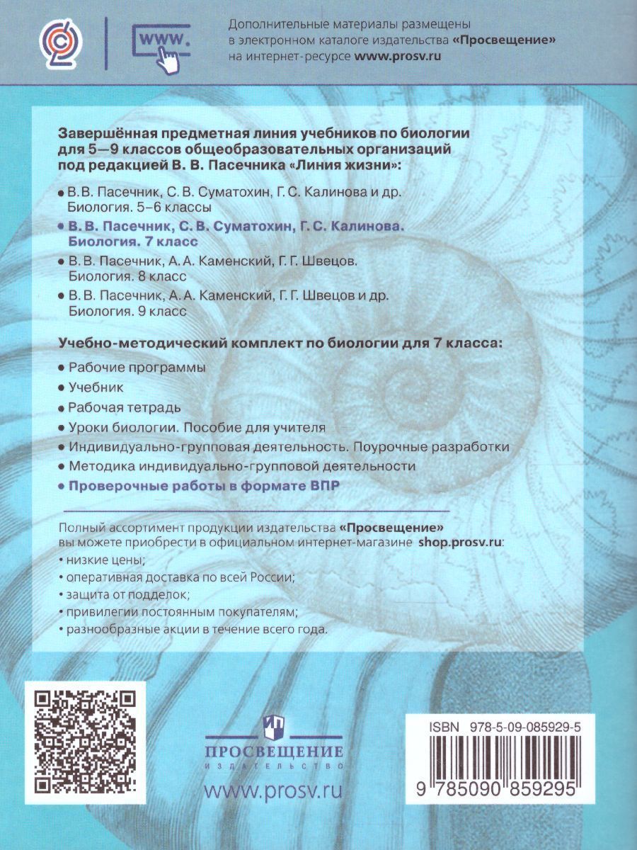 Учебное пособие входит в состав учебнометодического комплекта по биологии «Линия жизни» под редакцией В. В. Пасечника. Пособие адресовано учащимся 7 классов и предназначено для проведения промежуточного и итогового контроля образовательных результатов обучения биологии. В проверочных работах содержатся типы заданий, включаемые во Всероссийские проверочные работы по биологии.Характеристики