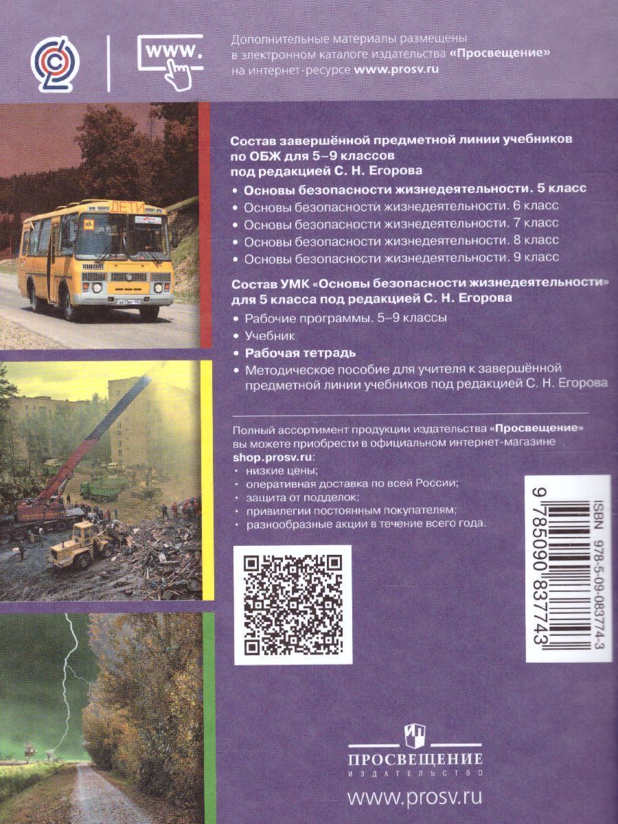 В рабочую тетрадь включены тесты и тестовые задания, рассчитанные на выработку у учащихся способностей самостоятельно искать и находить решения проблем по обеспечению личной безопасности и безопасности окружающих. Учебное пособие дополняет предметную линию учебников под редакцией С. Н. Егорова. Структура пособия соответствует учебнику «Основы безопасности жизнедеятельности. 5 класс» (под редакцией С. Н. Егорова).Характеристики
