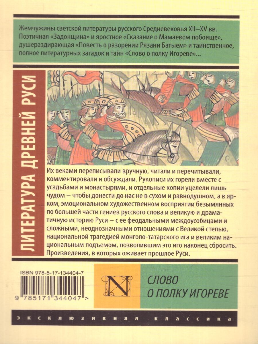 Слово о полку Игореве. Эксклюзив: Русская классика. Жемчужины светской литературы русского Средневековья XII – XV вв. Поэтичная "Задонщина" и яростное "Сказание о Мамаевом побоище", душераздирающая "Повесть о разорении Рязани Батыем" и таинственное, полное литературных загадок и тайн "Слово о полку Игореве"... Их веками переписывали вручную, читали и перечитывали, комментировали и обсуждали. Рукописи их горели вместе с усадьбами и монастырями, и отдельные копии уцелели лишь чудом – чтобы донести до нас не в сухом и равнодушном, а в ярком, эмоциональном художественном восприятии безымянных по большей части гениев русского слова и великую и драматичную историю Руси – с ее феодальными междоусобицами и сложными, неоднозначными отношениями с Великой cтепью, национальной трагедией монголо-татарского ига и великим национальным подъемом, позволившим это иго наконец сбросить. Произведения, в которых оживает прошлое Руси.Характеристики