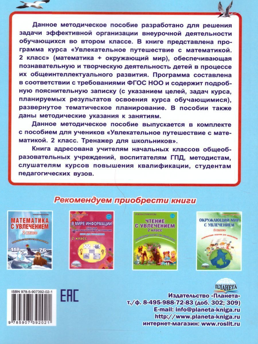 Данное методическое пособие разработано для решения задачи эффективной организации внеурочной деятельности обучающихся во втором классе. В книге представлена программа курса «Увлекательное путешествие с математикой. 2 класс» (математика + окружающий мир), обеспечивающая познавательную и творческую деятельность детей в процессе их общеинтеллектуального развития. Программа составлена в соответствии с требованиями ФГОС НОО и содержит подробную пояснительную записку (с указанием целей, задач курса, планируемых результатов освоения курса обучающимися), развернутое тематическое планирование. В пособии также даны методические указания к занятиям. Данное методическое пособие выпускается в комплекте с пособием для учеников «Увлекательное путешествие с математикой. 2 класс. Тренажер для школьников». Книга адресована учителям начальных классов общеобразовательных учреждений, воспитателям ГПД, методистам, слушателям курсов повышения квалификации, студентам педагогических вузов.Характеристики