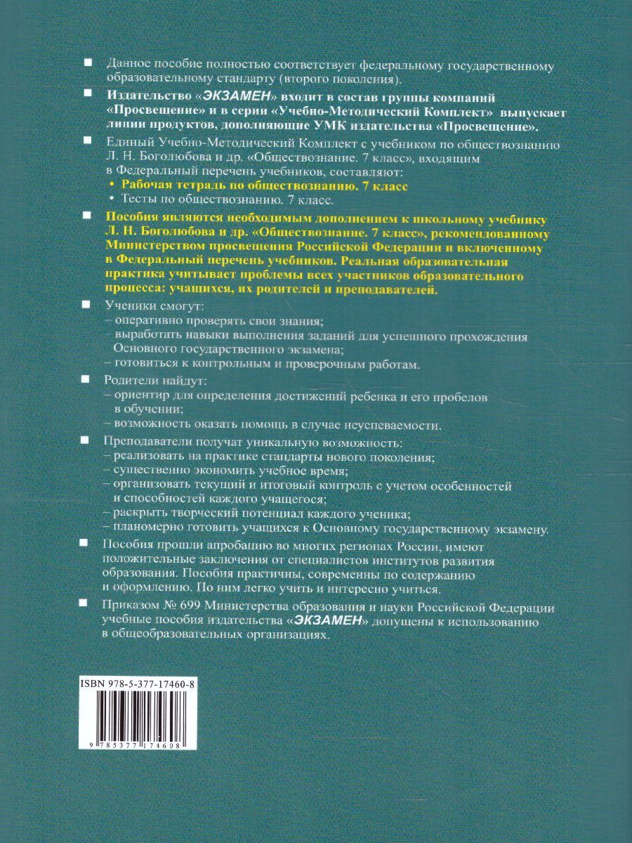 Данное пособие полностью соответствует федеральному государственному образовательному стандарту (второго поколения). Рабочая тетрадь соответствует содержанию и структуре учебника по обществознанию для 7 класса Л. Н. Боголюбова и др. В неё включено большое количество разнообразных по форме и уровню сложности заданий, с помощью которых учащиеся повторяют и углубляют полученные на уроках знания, закрепляют и совершенствуют необходимые умения и навыки, а учитель на практике реализует новые стандарты. В рабочей тетради много заданий, составленных по типу заданий Основного государственного экзамена, на доступном семиклассникам содержании.Характеристики