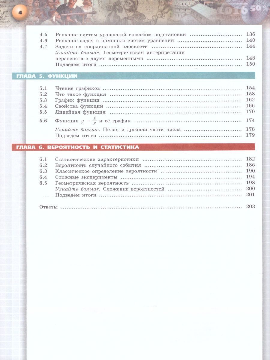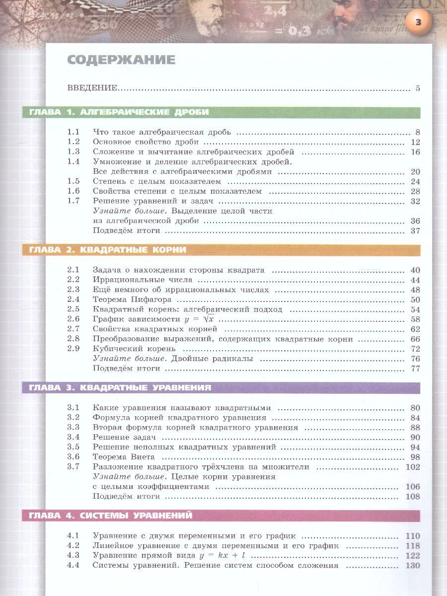 Учебник по алгебре 8 класса входит в линию учебно-методических комплексов "Сферы" по математике, начатую учебниками для 5–6 классов. Оно подготовлено в соответствии с требованиями Федерального государственного образовательного стандарта. В содержательном плане пособия этой линии отличает усиление общекультурной составляющей, систематическая демонстрация связи математики с окружающим миром, внимание к развитию познавательных способностей ученика, коммуникативных умений. Принципиальными особенностями учебника являются фиксированный в тематических разворотах формат, лаконичность и чёткая структурированность текста, использование полей для специальных рубрик с историческими сведениями, справочным материалом, образцами решения, структурированность системы упражнений. Всё это стимулирует осознанное и мотивированное освоение содержания, развитие интереса к предмету.Характеристики