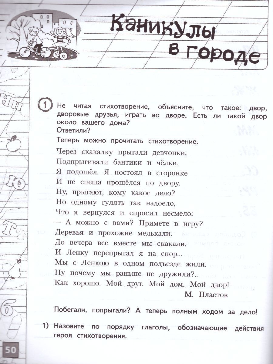 Цель данного пособия — в увлекательной игровой форме систематизировать и повторить материал, пройденный в первом классе, закрепить необходимую базу знаний для изучения русского языка во втором классе. Тетрадь содержит не только привычные упражнения, но и занимательные ребусы, загадки, потешки и пр. То есть позволит повторить курс по русскому языку и одновременно развить память, мышление и логику. В конце пособия дан раздел «Справочные материалы» с краткими теоретическими сведениями по русскому языку для повторения. Тетрадь летних заданий является универсальным пособием и может быть использована с любым учебно-методическим комплексом.Характеристики